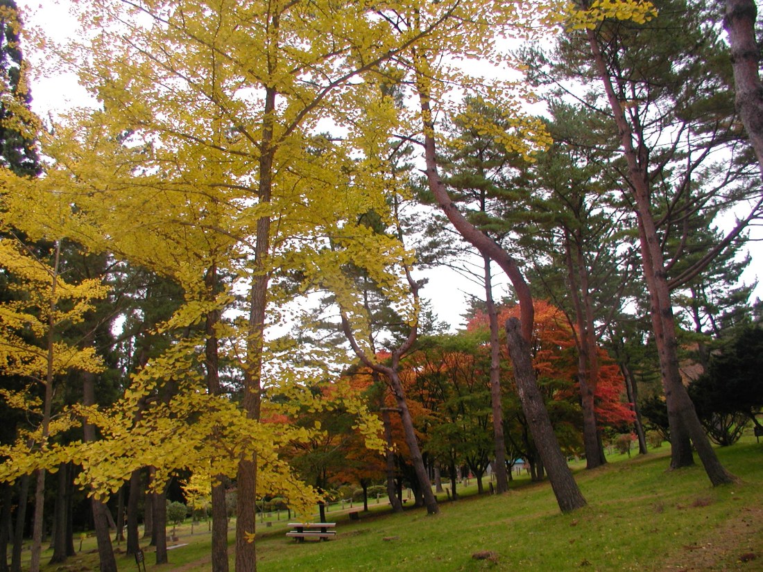 秋色や イロハモミジに イチョウの木