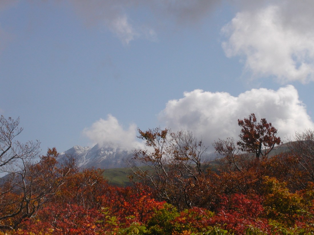 晩秋や 山 雪帽子 紅葉に