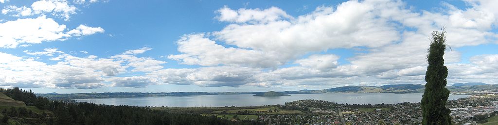 This is a panoramic view of Lake Rotorua from Mount Ngongotaha.