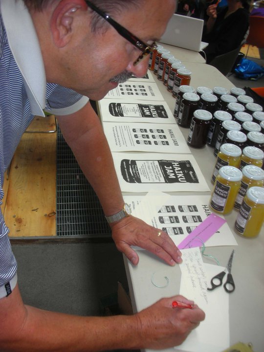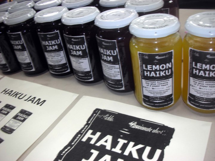 This is a phototograph of one of a limited edition series of six jars of haiku jam by artist poet and cultural forager Paul Conneally. Each jar of haiku jam has a haiku by award winning haiku poet Alan Summers with a Japanese translation by Hidenori Hiruta published on it.