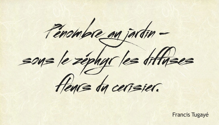 On April 18, Francis Tugayé, a haikuist friend of mine in France, who is a French artist, contributed haiku and haiku pix to me, giving encouragement and prayers to us. This is because Francis loves Japanese culture so much.