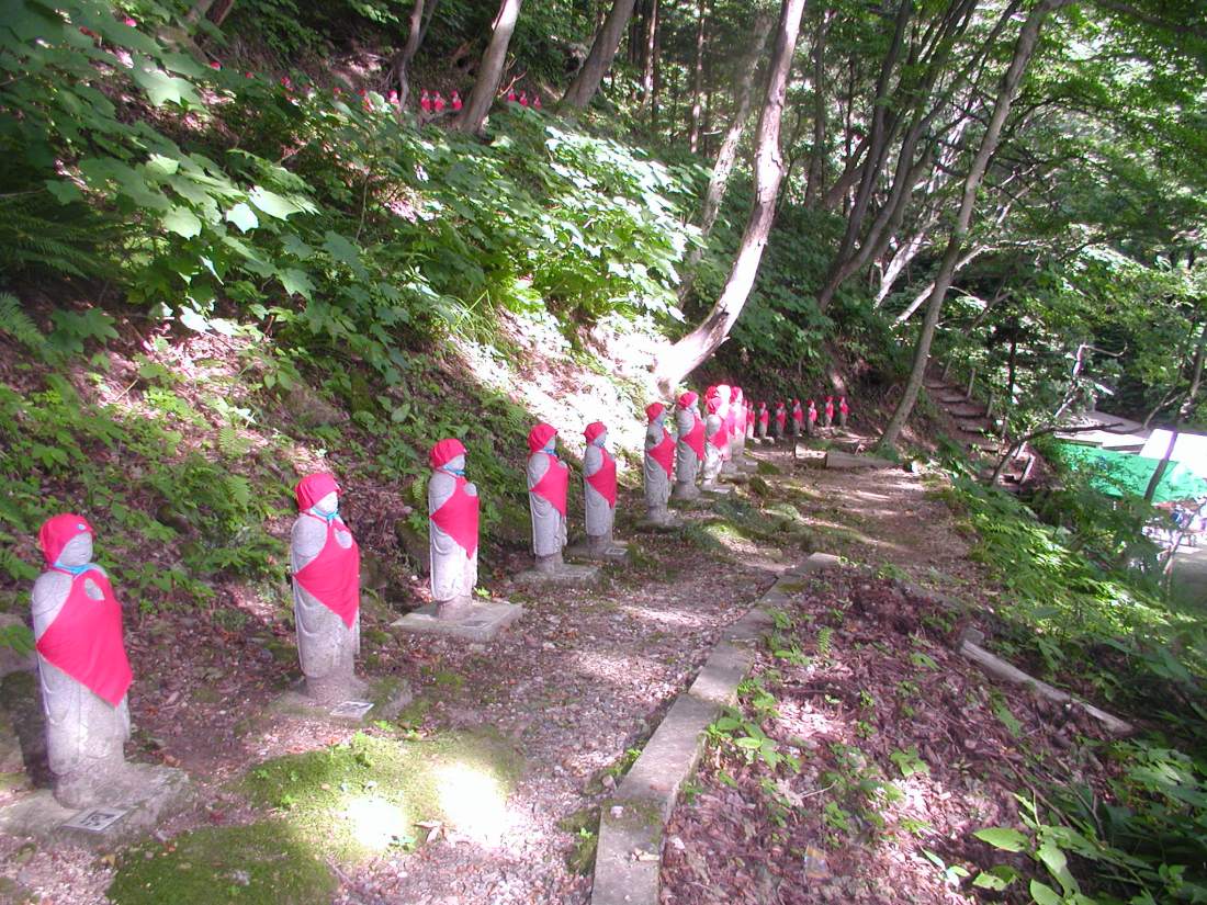 「戦争のない世の中を」「落盤事故の犠牲者供養に」‐。由利本荘市岩谷麓にある折渡峠の遊歩道沿いに、高さ六十(センチ)の地蔵千十二体が整然と並ぶ。地蔵は個人の供養仏。県内外に寄進者がおり、七月二十四日の地蔵盆に合わせて行われる例祭には、毎年多くの参拝者が訪れる。