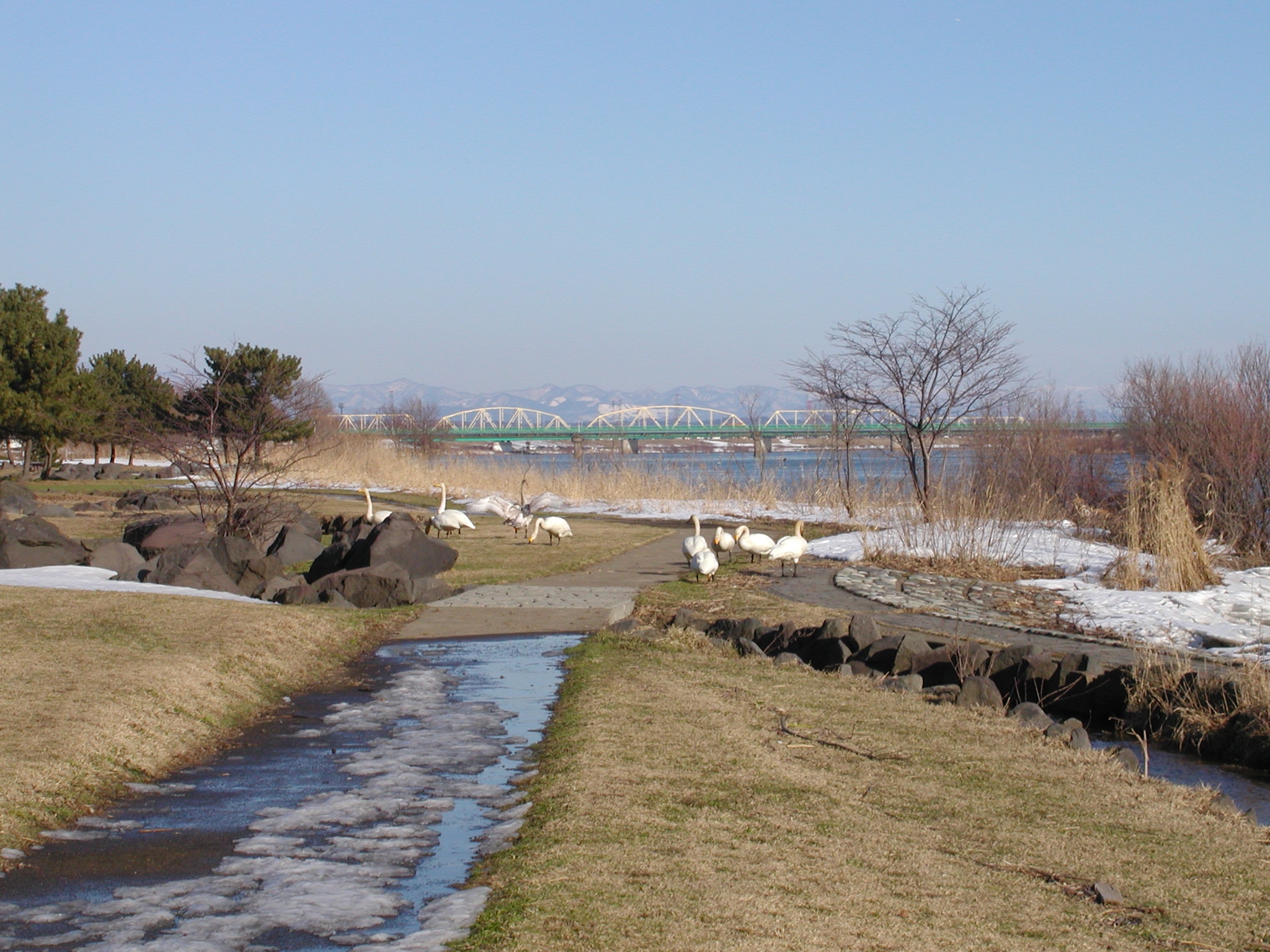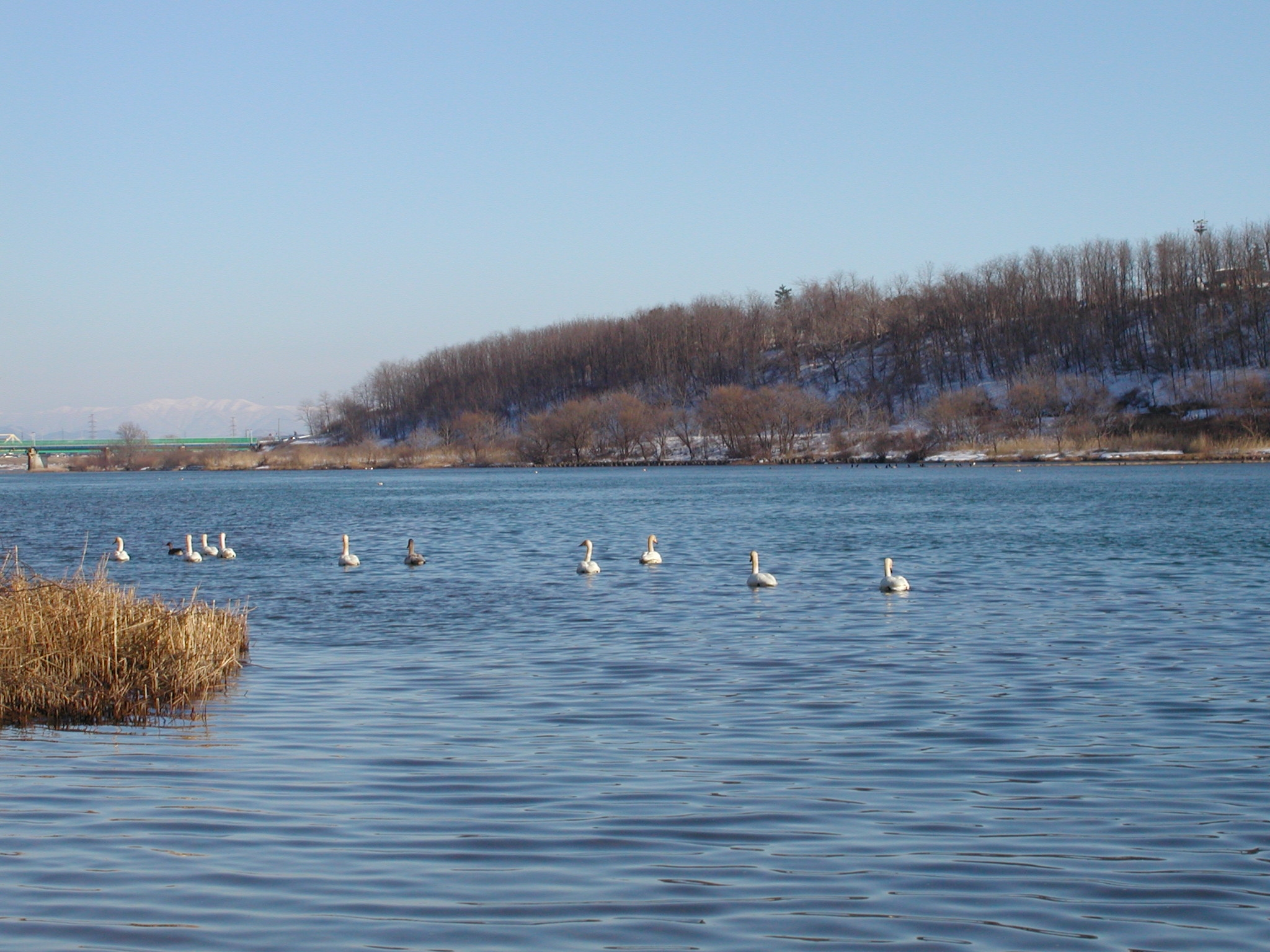 On February 29, I happened to see ten swans in the sun at the bank of the Omono River (雄物川) in Akita prefecture (秋田県). It was such a peaceful view. The swans enjoyed themselves on a fine early spring day.