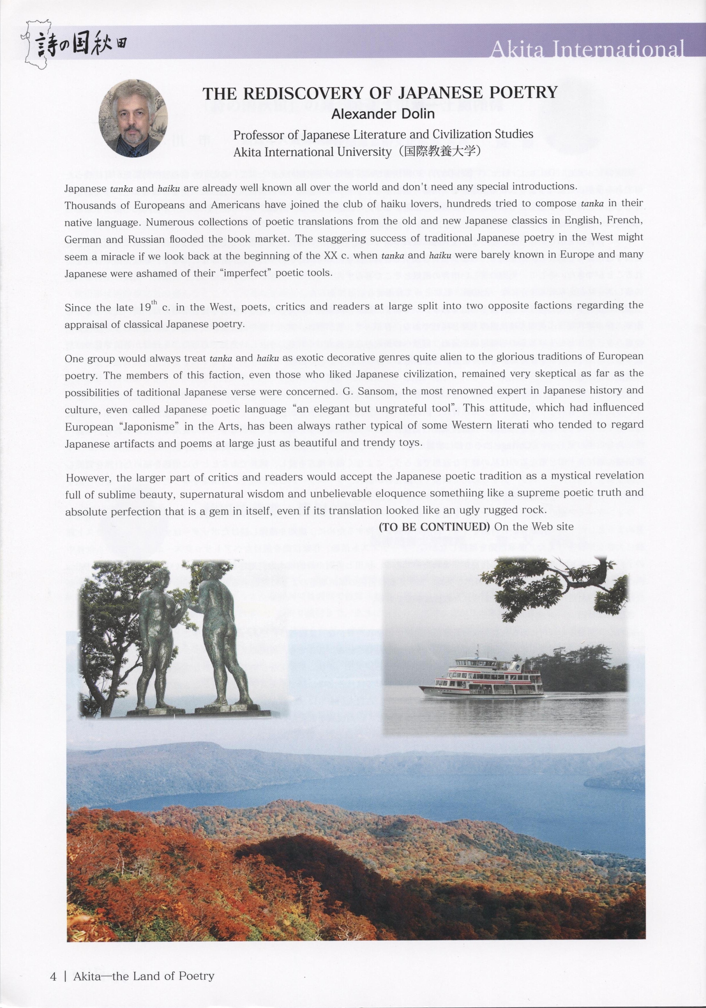 Prof. Dolin kindly contributed to us the following article “The Rediscovery of Japanese Poetry” for the yearly pamphlet 『詩の国秋田 : Akita – the Land of Poetry 』published in August , 2009.