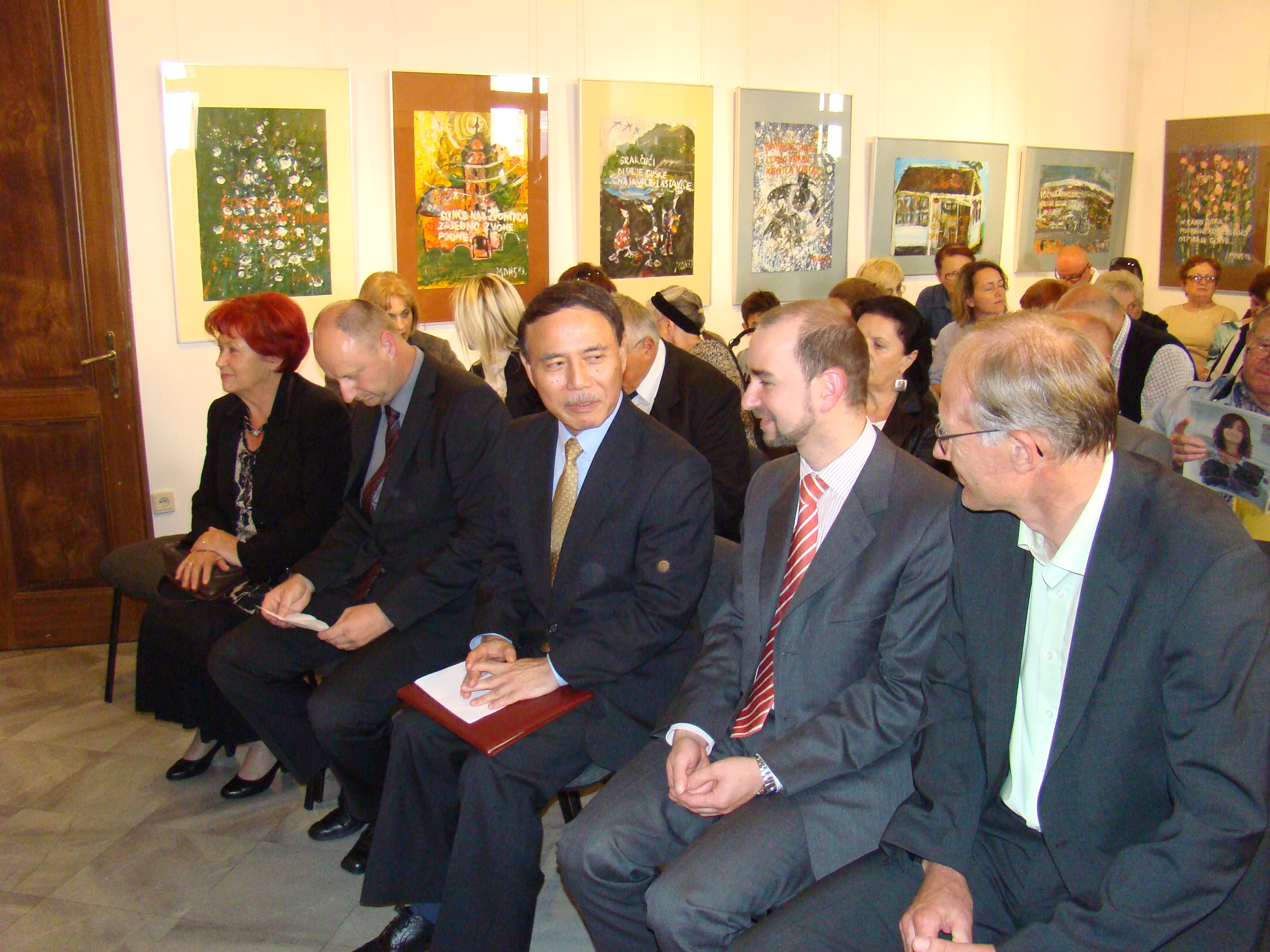 This is the photo: Gallery of the town of Krapina, Croatia: Mrs. Sonja Borovcak, The former Prefect of Krapina-Zagorje county, Mr. Zeljko Kolar, the new Prefect , His Excellency, Mr.Masaru Tsuji and many others on the 15th Haiku Day Dubravko Ivancan in Krapina, Croatia. It’s an annual haiku meeting of Croatian haiku poets with a contest for haiku in Croatian standard language and the Kajkavian Dialect. This year, altogether for the third time, Stjepan Rozic has taken the first prize (this year for haiku in Kajkavian dialect) and Malvina Mileta for haiku in Croatian. On the wall, the paintings are illustrations of the winning haiku. The first prizes are given as a gift to the winners. Second and third prize haigas become a part of a permanent exhibition in the Gallery of the town of Krapina.