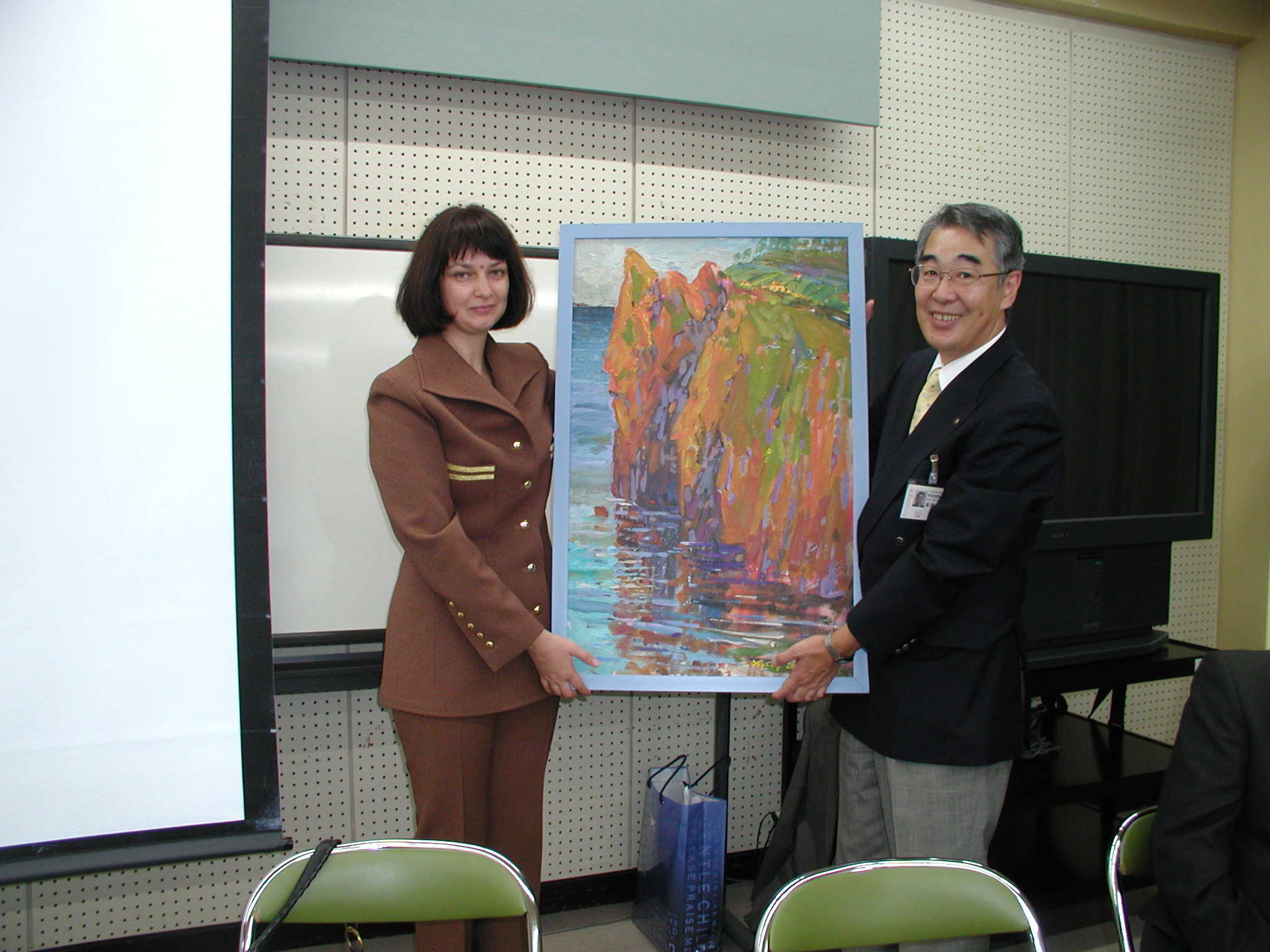 In return, SUMAROKOVA Olga, assistant director at JAPAN CENTER IN VLADIVOSTOK, presented such a fine painting by a Russian artist to Akita Prefectural Government.