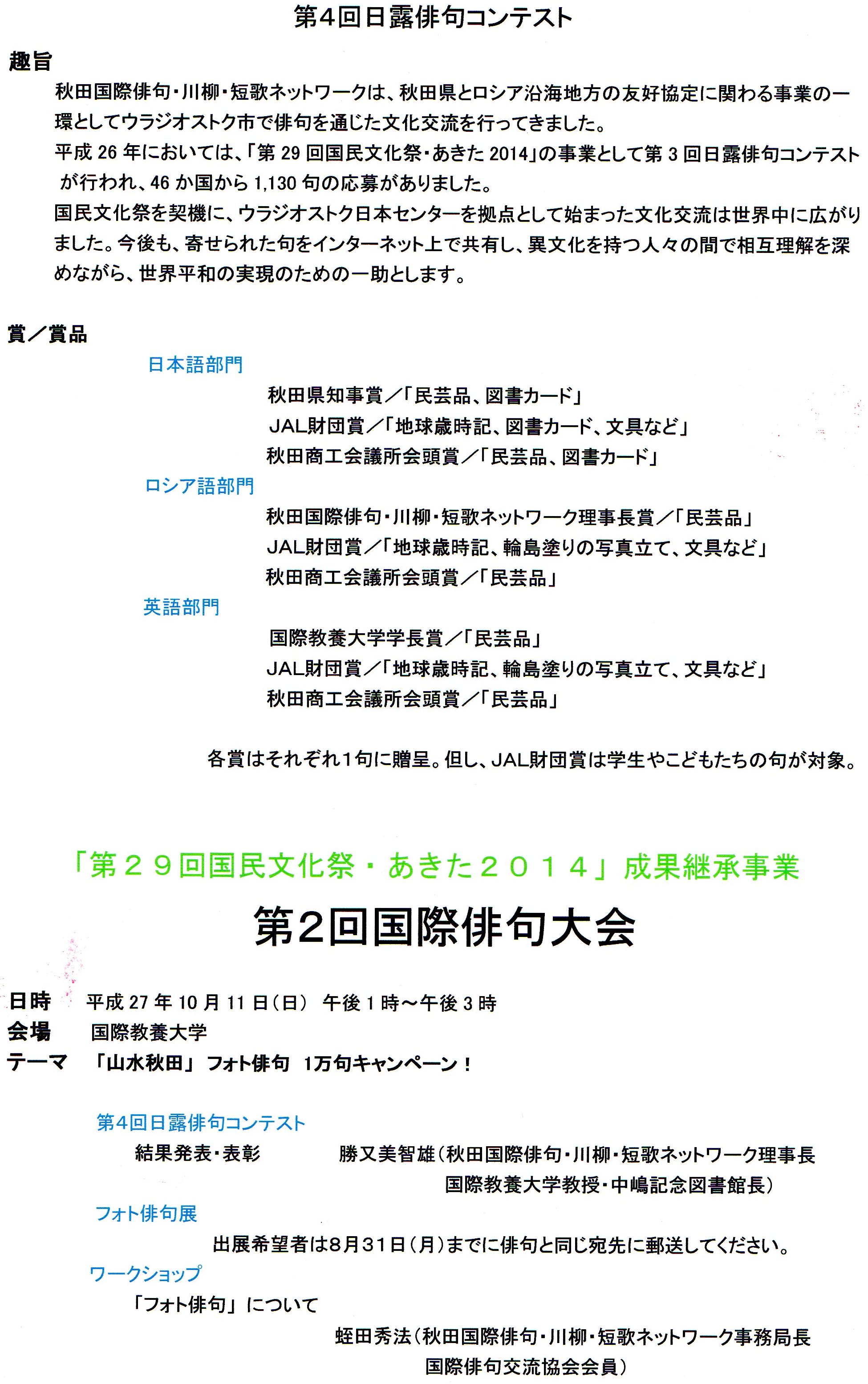 平成26年においては、「第29回国民文化祭・あきた2014」の事業として第3回日露俳句コンテストと国際俳句大会が行われました。