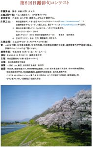 6th Haiku Contest(チラシ) Hiruta 2017/05/01 Published by Hiruta I am a haiku poet. Let's share haiku, shall we? View all posts by Hiruta Published 2017/05/01