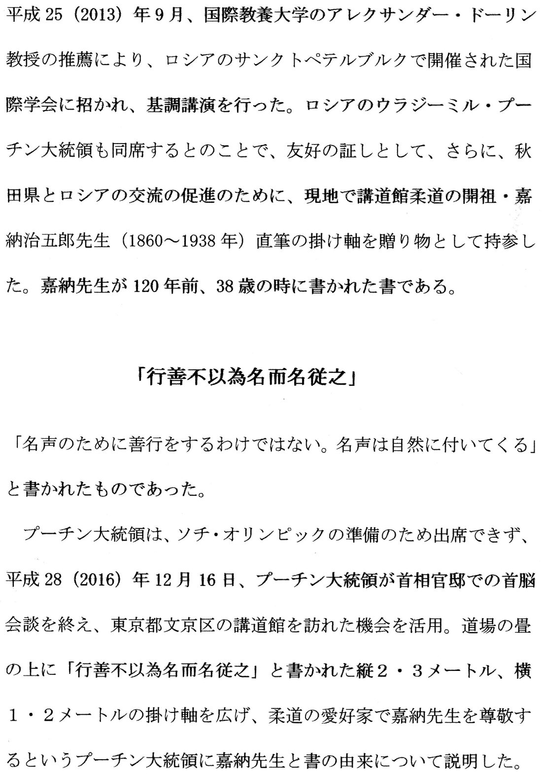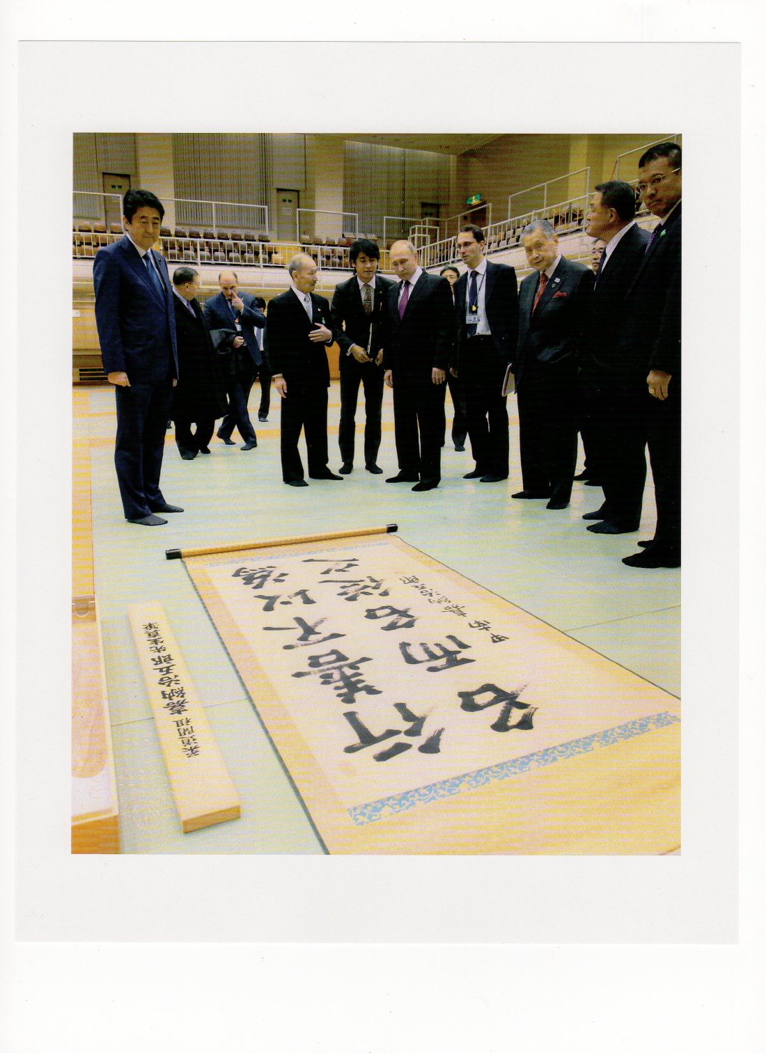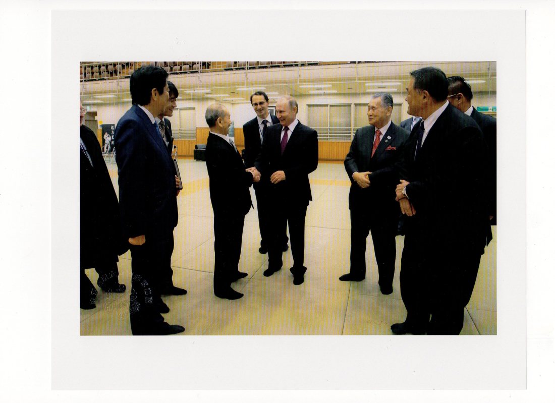 安倍晋三首相、森喜朗元首相、山下泰裕全日本柔道連盟会長始め、関係者が笑顔を浮かべながら見守る中、プーチン大統領と私は「今後の友好交流」の促進を誓いながら、固い握手を交わした。