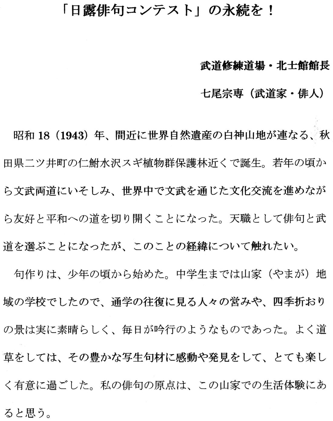 「日露俳句コンテスト」の永続を! 武道修練道場・北士館館長