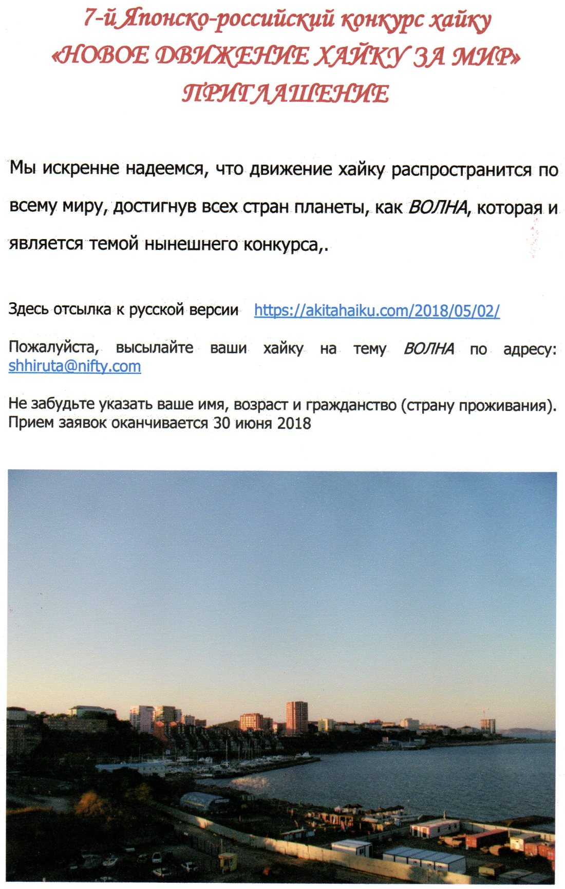 Предельный срок посылки хайку на конкурс – 30 июня 2018 !