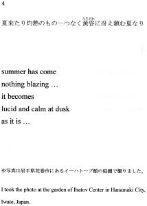 July-4 Hiruta 2018/07/09 Published by Hiruta I am a haiku poet. Let's share haiku, shall we? View all posts by Hiruta Published 2018/07/09