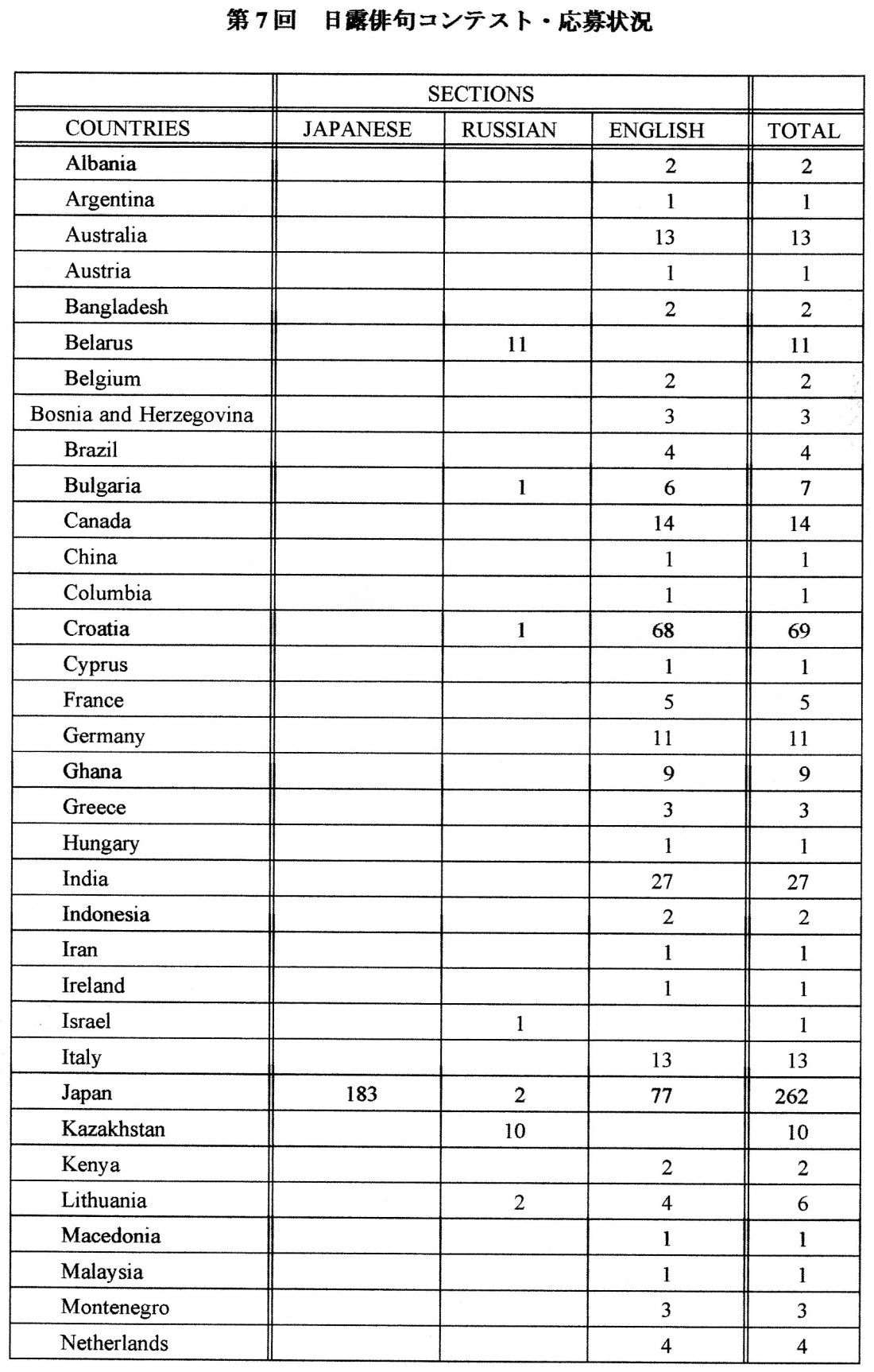 187 haiku were submitted to the Japanese section from 4 countries, 268 haiku to the Russian section from 12 countries, and 407 haiku to the English section from 52 countries.