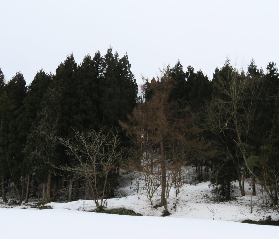杉木立 斑雪(はだら)の森に黒々と花粉となりて君は入りしか
