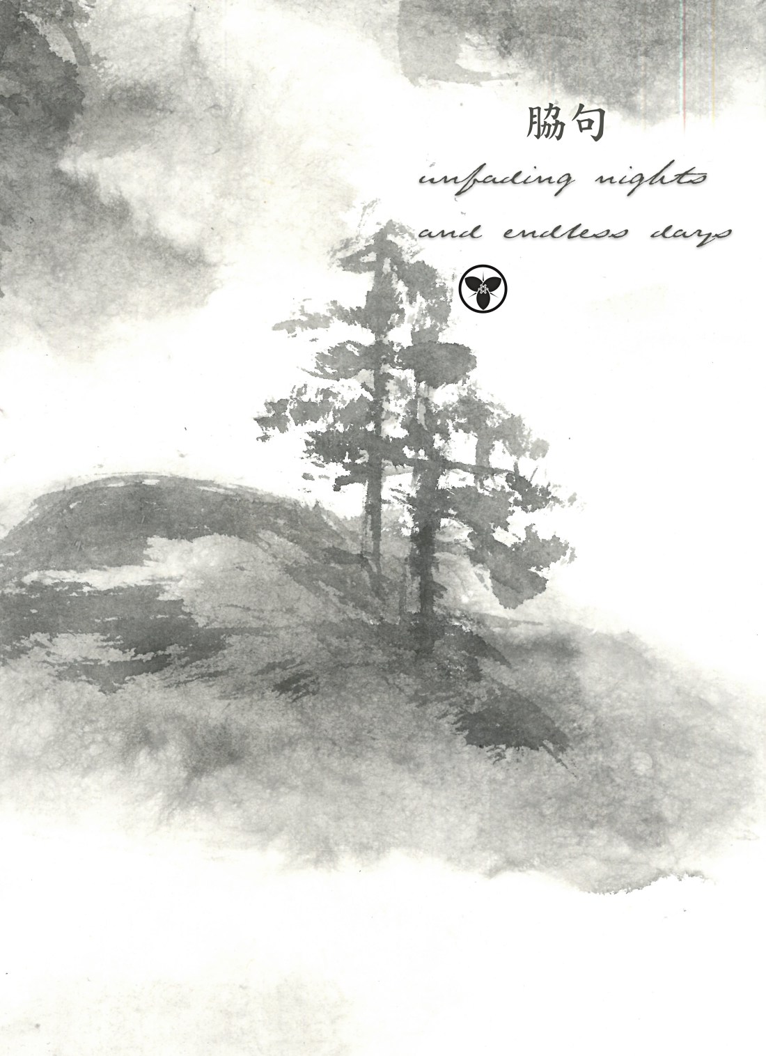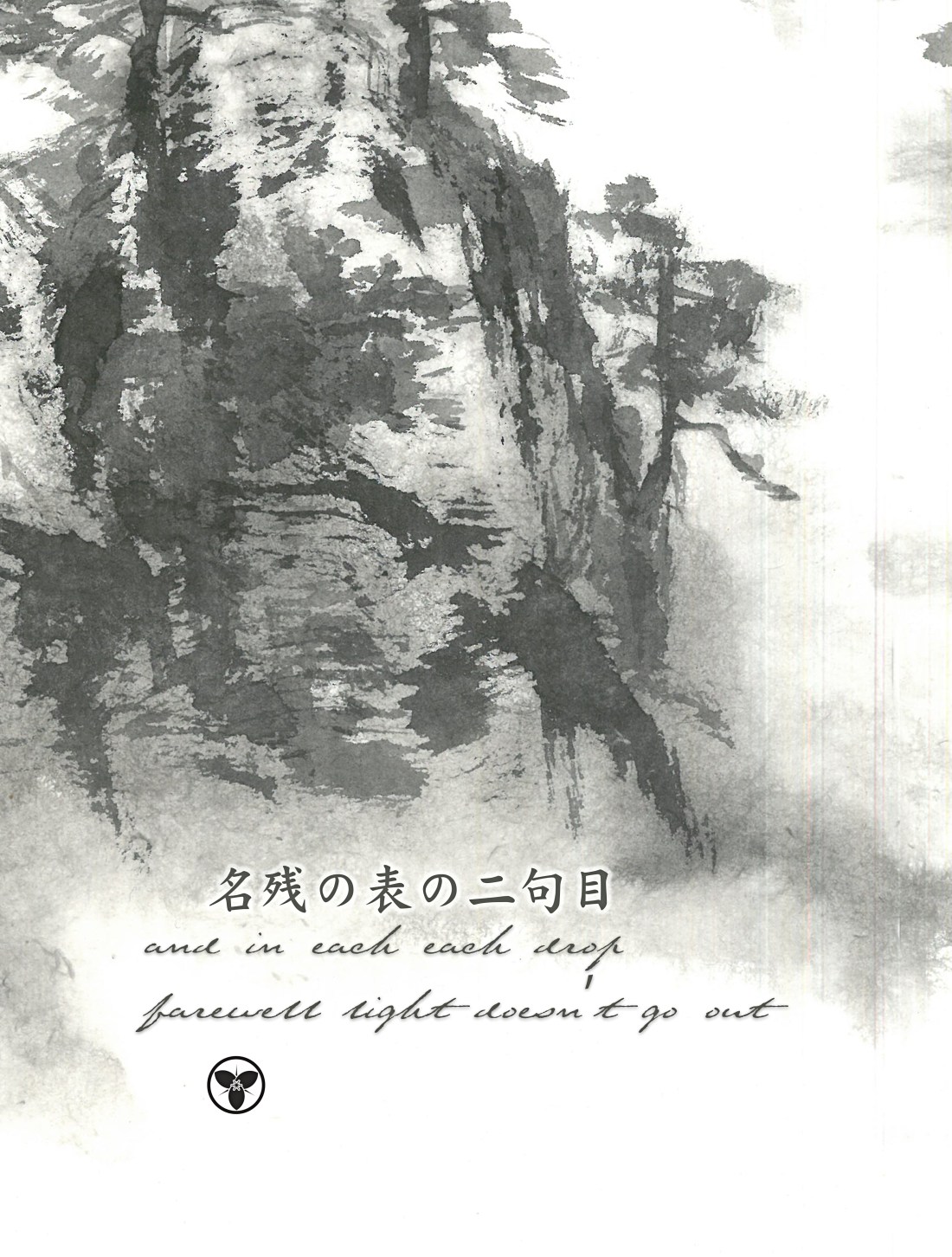 The illustrations, with the kind permission of the author Mitsunari Masyo, use fragments of an sumi-e drawing on rice paper «Pines on the rocks and fog rising over the bay» (2019).