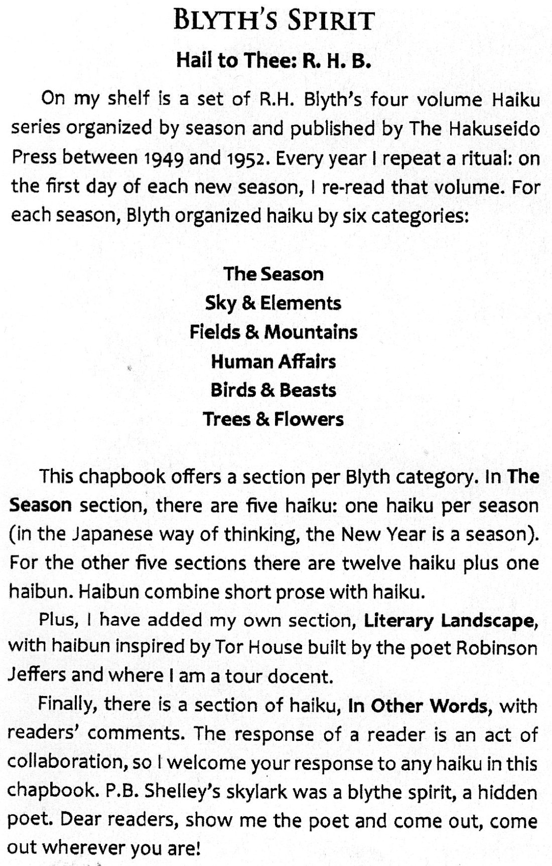 On September 21, 2013, Neal Whitman, kindly presented his haiku book BLYTH’S SPIRIT to me, which was reprinted as a gift-only edition, saying “A gift, like a beauty, is in the eyes of the holder. I hope one haiku – maybe more than one – brings you an a-ha moment.”