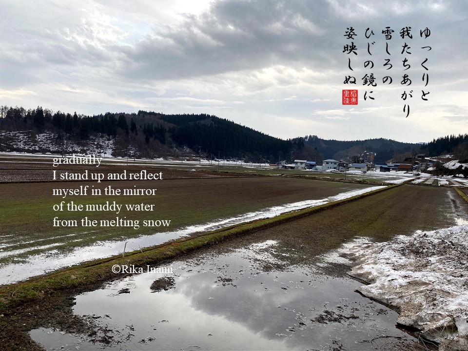 ゆっくりと我たちあがり雪しろの泥(ひじ)の鏡に姿映しぬ