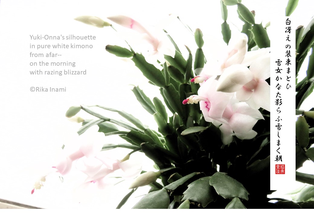 白冴えの装束まとひ雪女かなた影らふ雪しまく朝