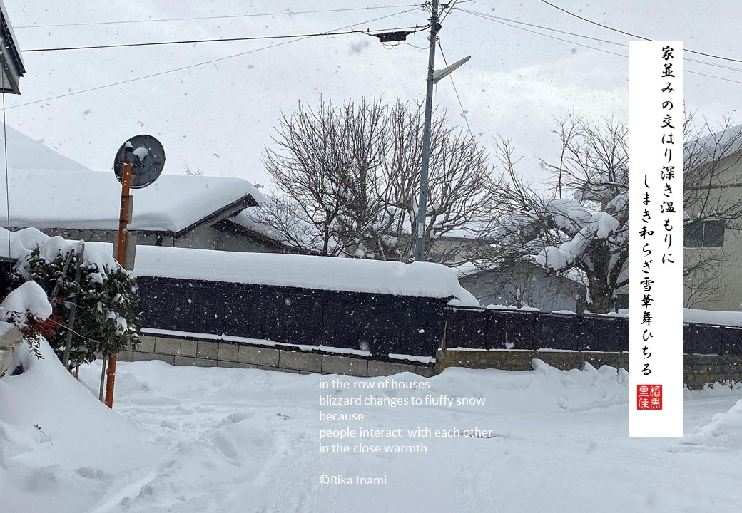 家並みの交はり深き温もりにしまき和らぎ雪華舞ひちる