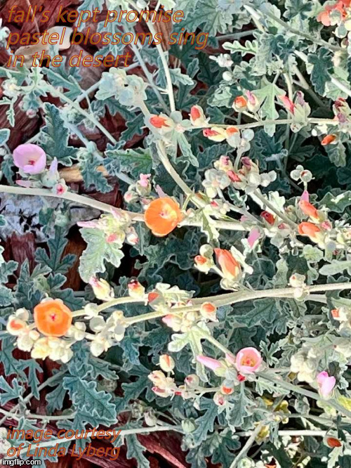 roped silhouette sways in red autumn's sunset breeze barkless oak limb groans ロープのシルエットが揺れる 赤い秋の夕焼けのそよ風に 樹皮のないオークの手足がうめく widows in black shrouds stoop today, wilting at graves mourning doves take flight 黒い覆いの未亡人 今日かがんで、墓でしおれる ナゲキバトが飛ぶ uniformed, seasoned they march erect down Main Street trying to forget 均一で慣れている 彼らはメインストリートを直立して行進する 忘れようとして black alpha wolf calls under winter's bright ice moon old elk, red and still 黒いアルファオオカミが叫ぶ 冬の明るい氷の月の下で 老いたヘラジカ、赤くて静か wind whistles through pines as early daffodils sway pale sun on gray ice 風が松を通って音を立てる 早期の水仙が揺れるように 灰色の氷の上の淡い太陽 chamomile flowers droop in dry September's sun winter's bedtime tea カモミールの花 乾燥した9月の太陽の下で垂れ下がる 冬の就寝時のお茶 dry rustling leaves under Hunter Moon silent owl wings 乾燥したざわめく葉 ハンタームーンの下で 静かなフクロウが飛んで行く