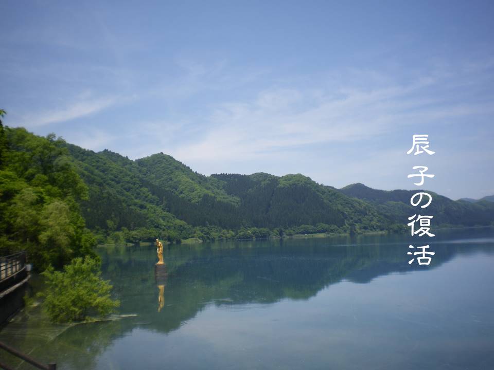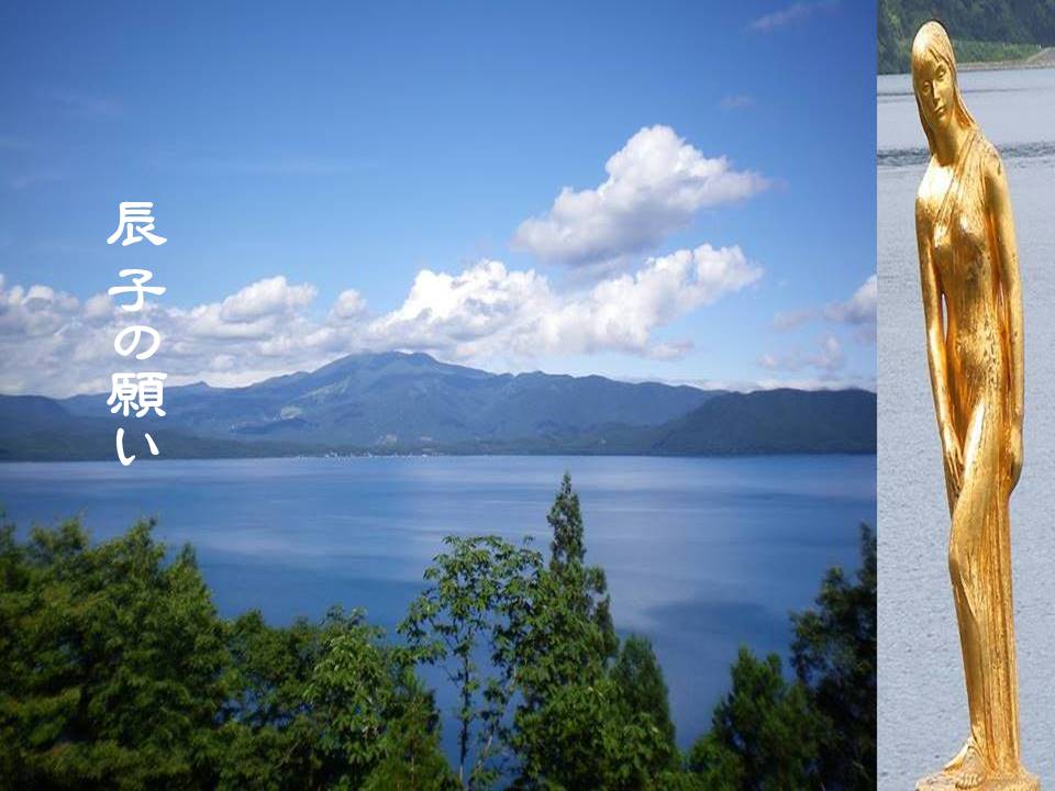 After her homecoming trip, Tatsuko climbed Katamaeyama-Shinrin Park. The lake and surrounding mountains were beautiful, clouds were mysterious, and trees were fresh green. However, Kunimasu disappeared from the lake after 1940. Fortunately, in 1968, Tatsuko was resurrected near the shore of Katajiri. Her eternal wish is to revive Lake Tazawa for Kunimasu to swim again.