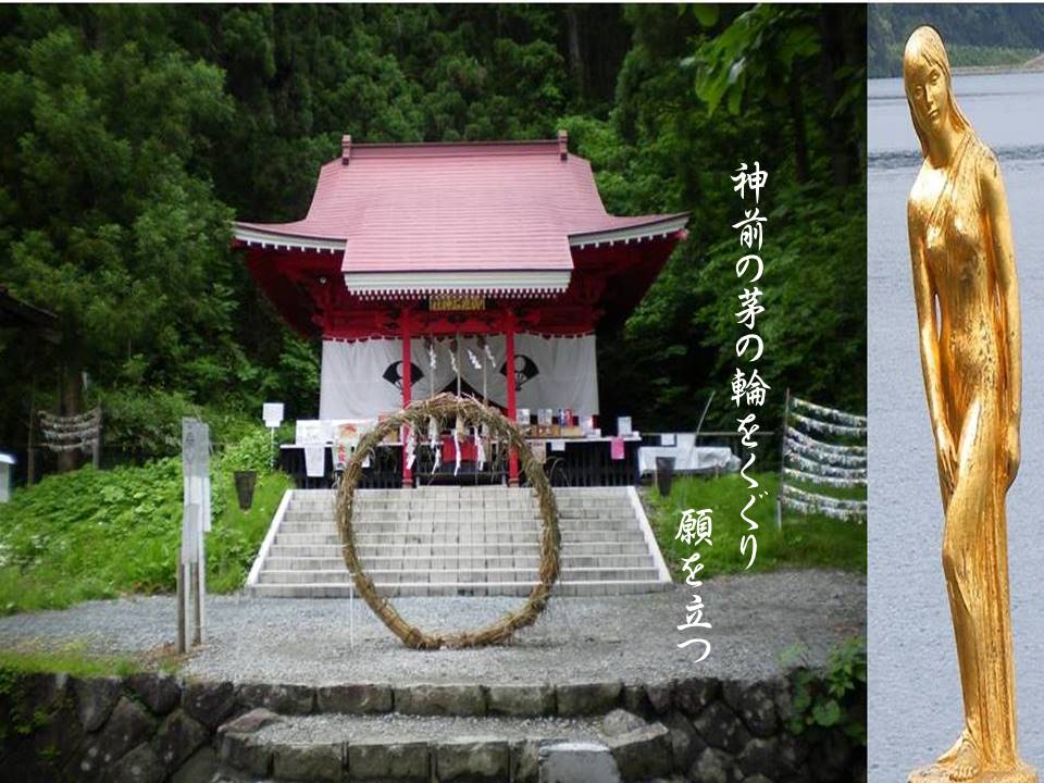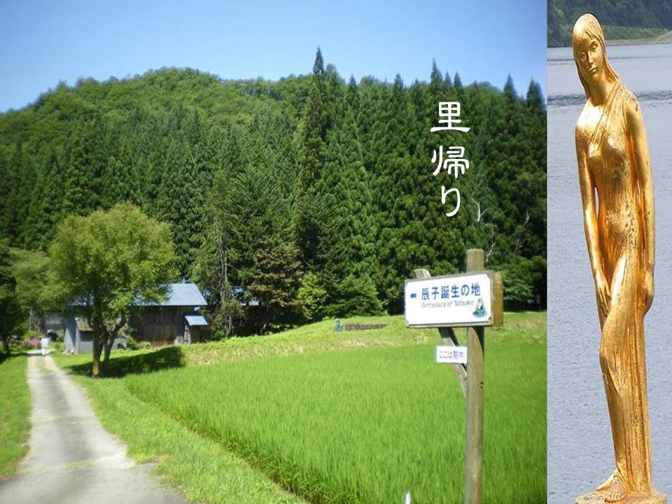 On July 30, 2020, HIRUTA Hidenori visited the birthplace of Tatsuko, and made up his mind to write a new version of the Legend of Tatsuko-hime. In his version, the nearby shrine called Ukiki-jinja Shrine, or Katajiri Myōjin is a renewed shrine which the resurrected Tatsuko inhabits forever. It is renamed Tatsuko-gū by Hidenori.