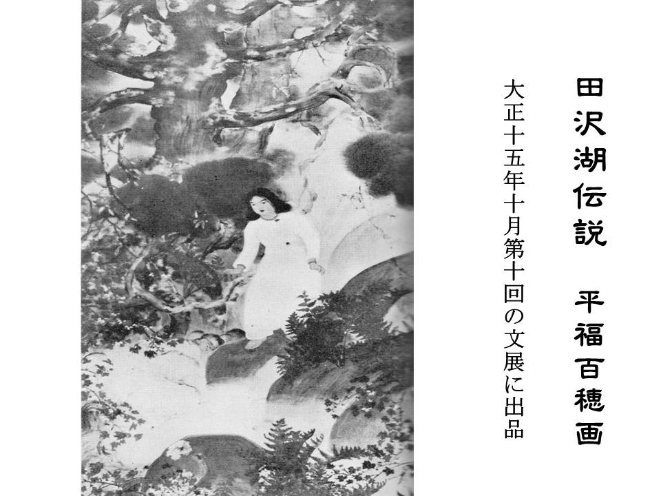 HIRAFUKU Hyakusui (1817-1933), a Japanese-style painter and tanka poet loved Lake Tazawa so deeply that he painted pictures and wrote tanka about the lake. In October, 1926, Hyakusui exhibited his painting titled The Legend of Lake Tazawa at the 10th Japan Fine Arts Exhibition.