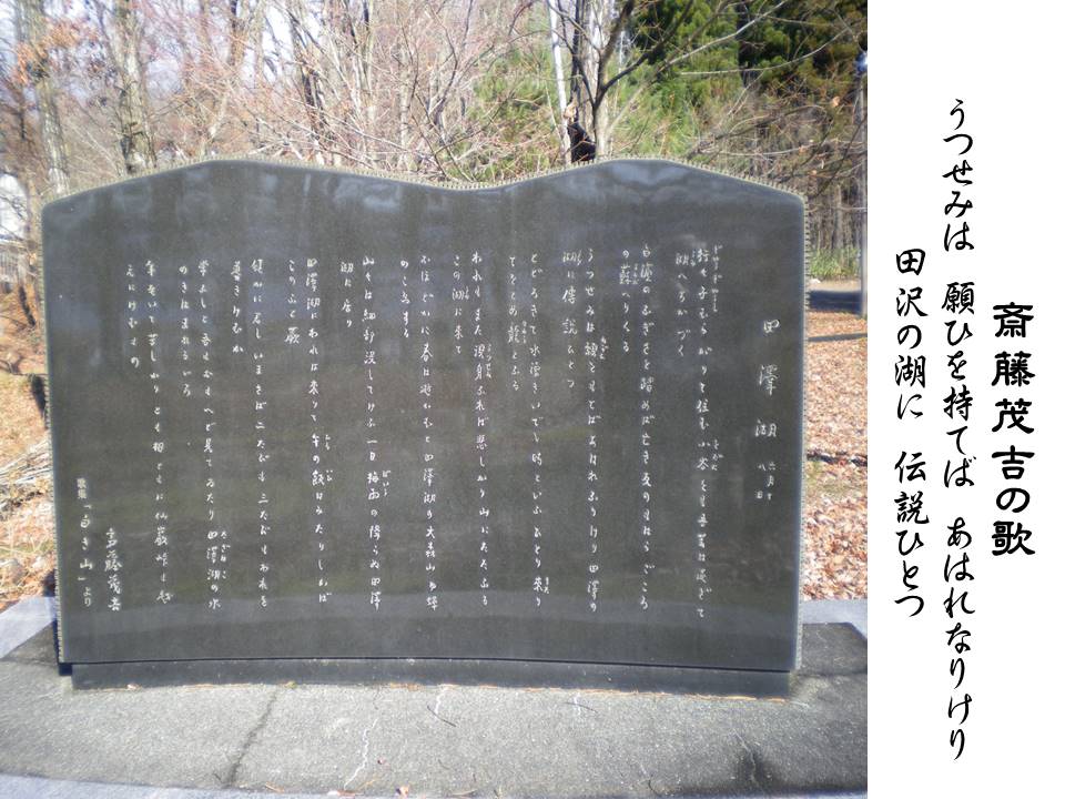 SAITŌ Mokichi (1882-1953) was a tanka poet and psychiatrist. In 1906, when he first met HIRAFUKU Hyakusui, the two poets became close friends. On June 18, 1947, Mokichi visited Lake Tazawa, and wrote the tanka about The Legend of Tatsuko-hime. It was about Tatsuko, who had a pitiful ending after her wish came true.