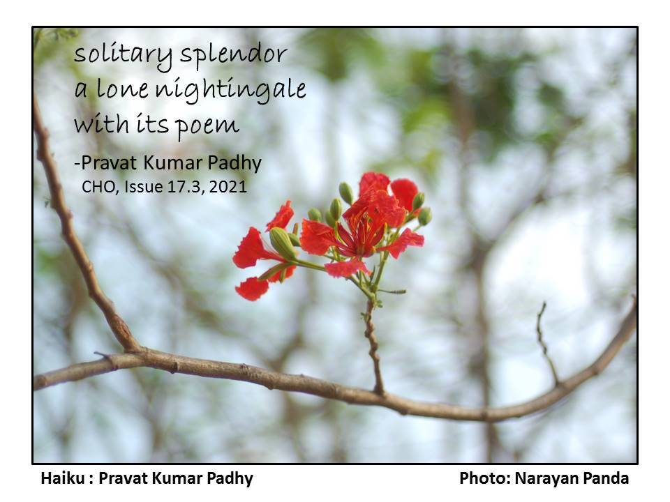 Pravat Kumar Padhy holds a Master of Science and a Ph.D from Indian Institute of Technology, ISM Dhanbad. He is a mainstream poet and a writer of Japanese short forms of poetry (haiku, tanka, haiga, haibun, tanka prose). His poem “How Beautiful” is included in the undergraduate curriculum at the university level. Pravat’s haiku own The Kloštar Ivanić International Haiku Award, Vancouver Cherry Blossom Festival Invitational Award, IAFOR Vladimir Devidé Haiku Award, Setouchi Matsuyama Photo Haiku Award, and others. His haiku are published in many international journals and anthologies including in Red Moon Anthology. Haiku are featured at “Haiku Wall”, Historic Liberty Theatre Gallery in Bend, Oregon, and at Mann Library, Cornell University. USA. His tanka is figured in “Kudo Resource Guide”, University of California, Berkeley. His tanka has been put on rendition (music by José Jesús de Azevedo Souza) in the Musical Drama Performance, ‘Coming Home’, The International Opera Through Art Songs, Toronto, Canada. His Taiga (Tanka-Photo) is featured in the 20th Anniversary Taiga Showcase of Tanka Society of America. His photo-haiku has been presented at Haiku North America Conference, 15-17, October 2021. Pravat is nominated as the panel judge of ‘The Haiku Foundation Touchstone Awards’, USA and is presently on the editorial board of the journal, ‘Under the Basho’.