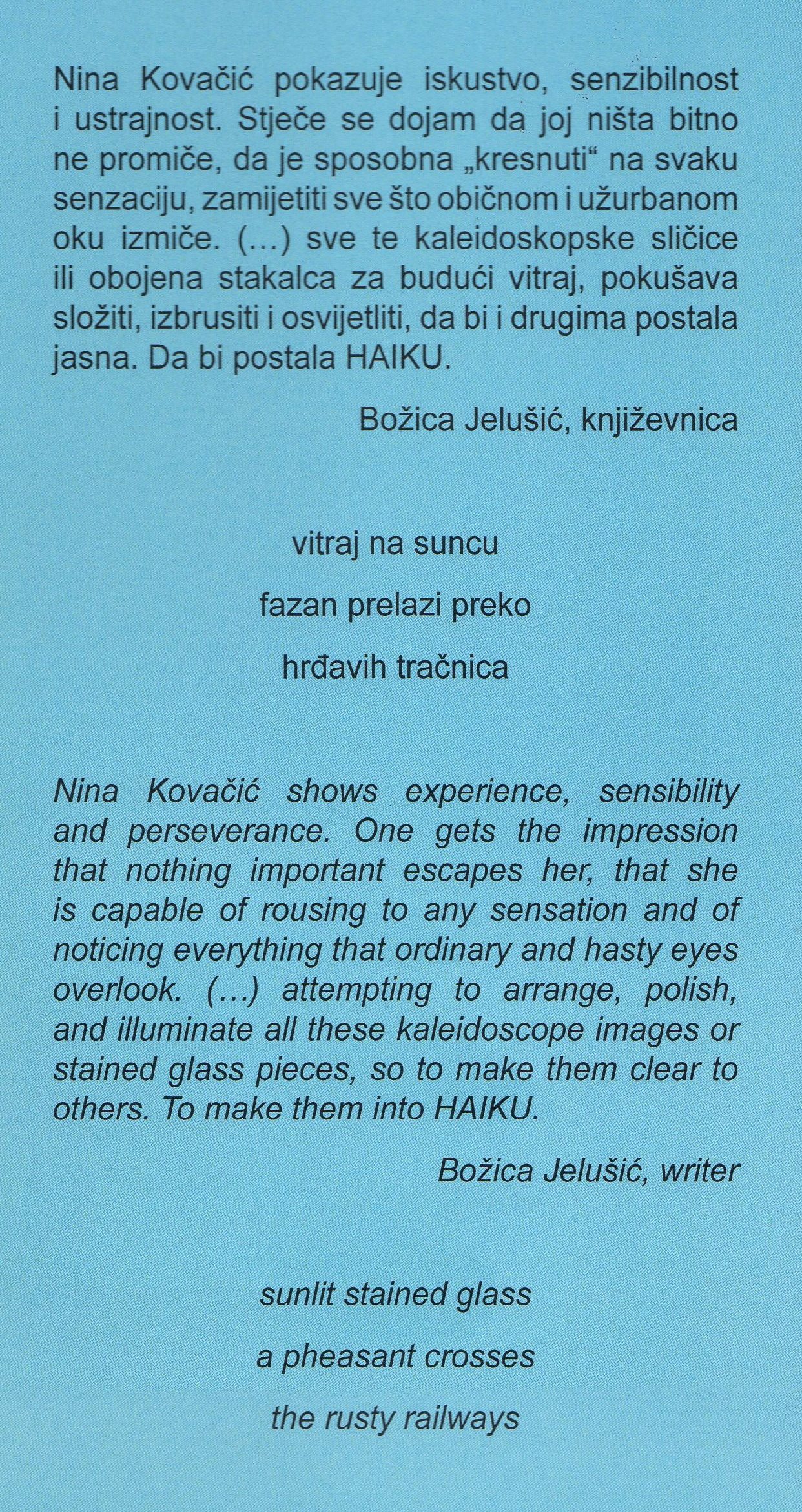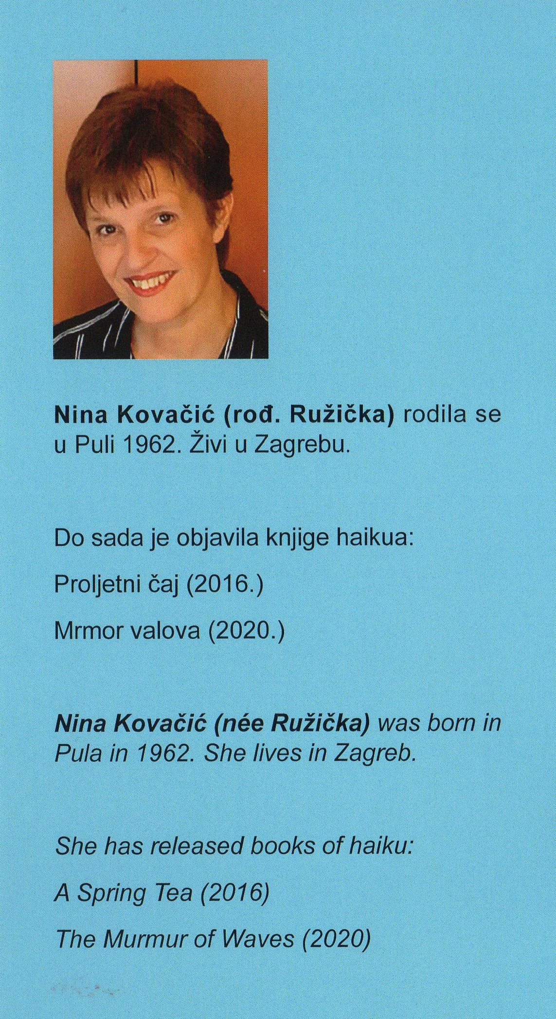 Nina Kovačić is a haiku poet in Croatia, who participated in the World Haiku Series 2019.