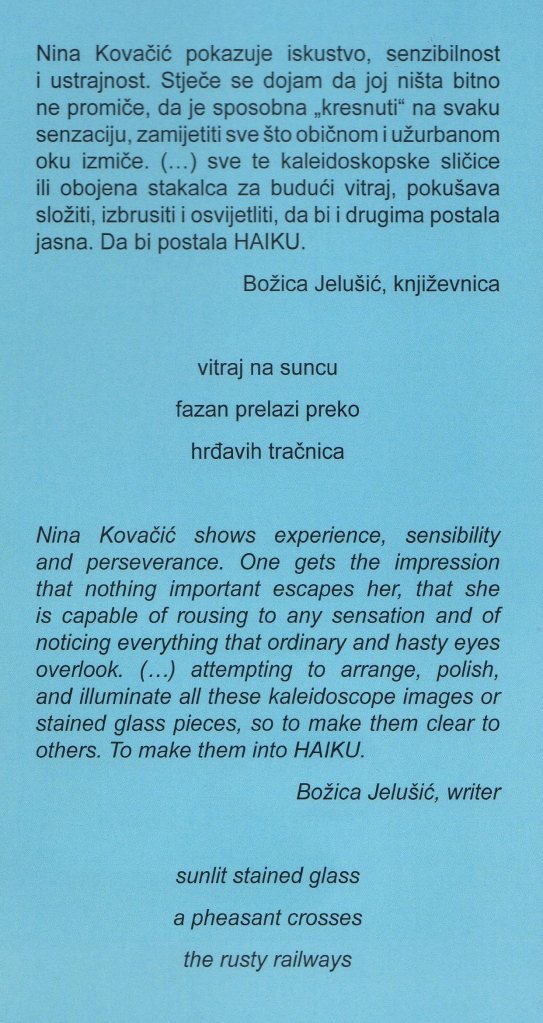 Her haiku appeared on the website of the Akita International Haiku Network with the title “World Haiku Series 2019 (141) Haiku by Nina Kovačić .”
