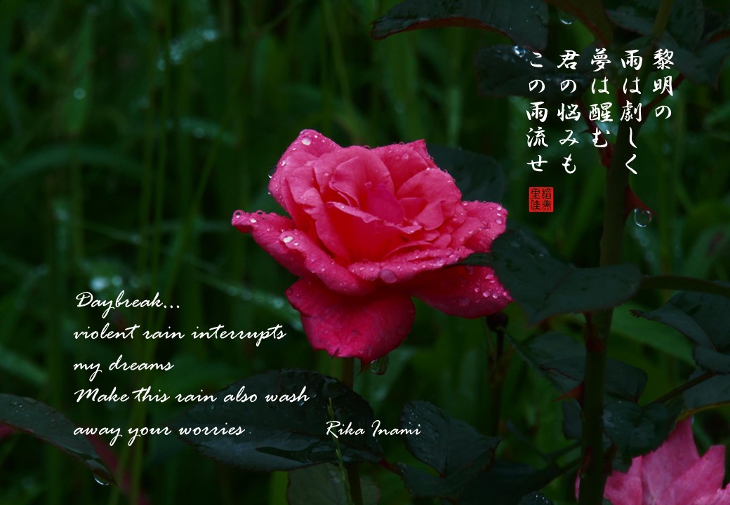 黎明の雨は劇(はげ)しく夢は醒む 君の悩みもこの雨流せ