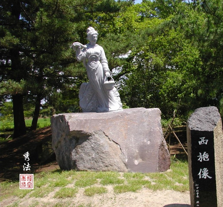 西施は紀元前5世紀の中国の春秋時代の越の国の美女であった。伝説によると、西施は越王勾践から呉王夫差に献上され、夫差は彼女を愛しすぎて政務と防衛を怠り、ついに越に敗北。彼女は越に戻って、勾践の家来である恋人と一緒に湖上の舟に乗り、姿を消したとのことです。