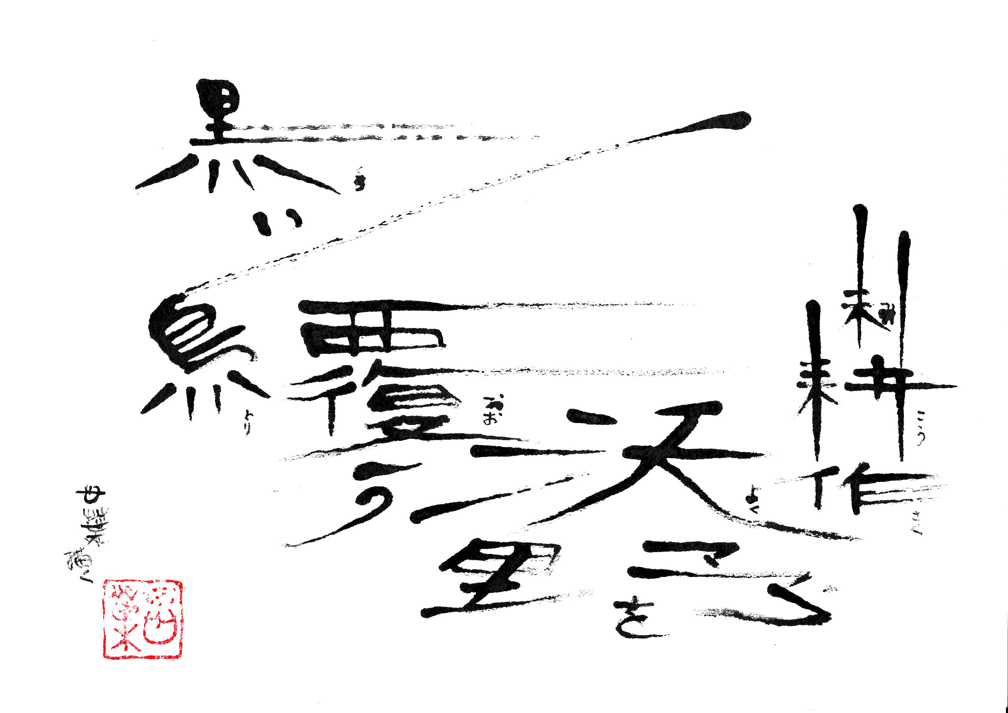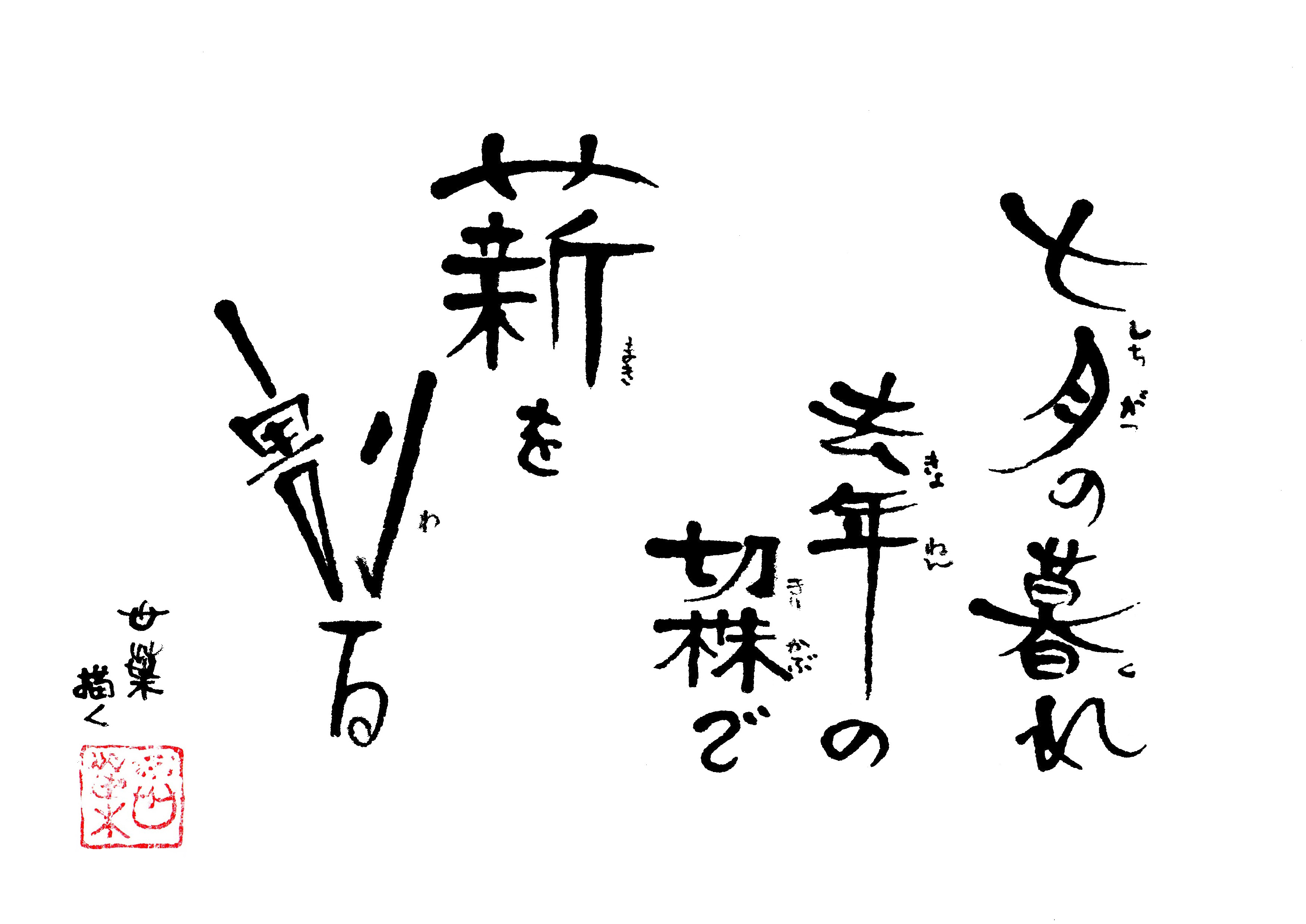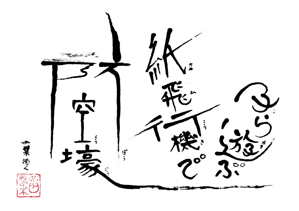 愛乃心葉 (Aino Shinyō) is a pseudonym. She writes her poems in the form of calligraphy by a disposal wooden chopstick. She calls her poetry “Kotodama calligraphic painting.” She expresses the spirits of words, that is, KOTODAMA, in her chopstick calligraphic painting. The aim is to express her wish for “a land blessed with KOTODAMA”, which is associated with 万葉集 (Man’yōshū).