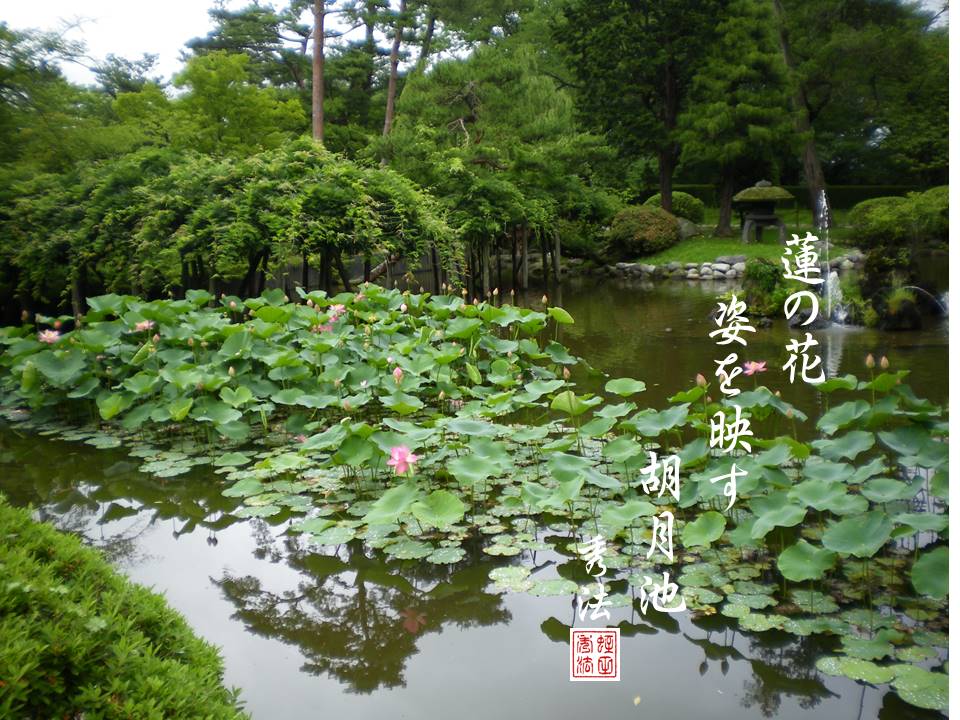 蓮の花姿を映す胡月池