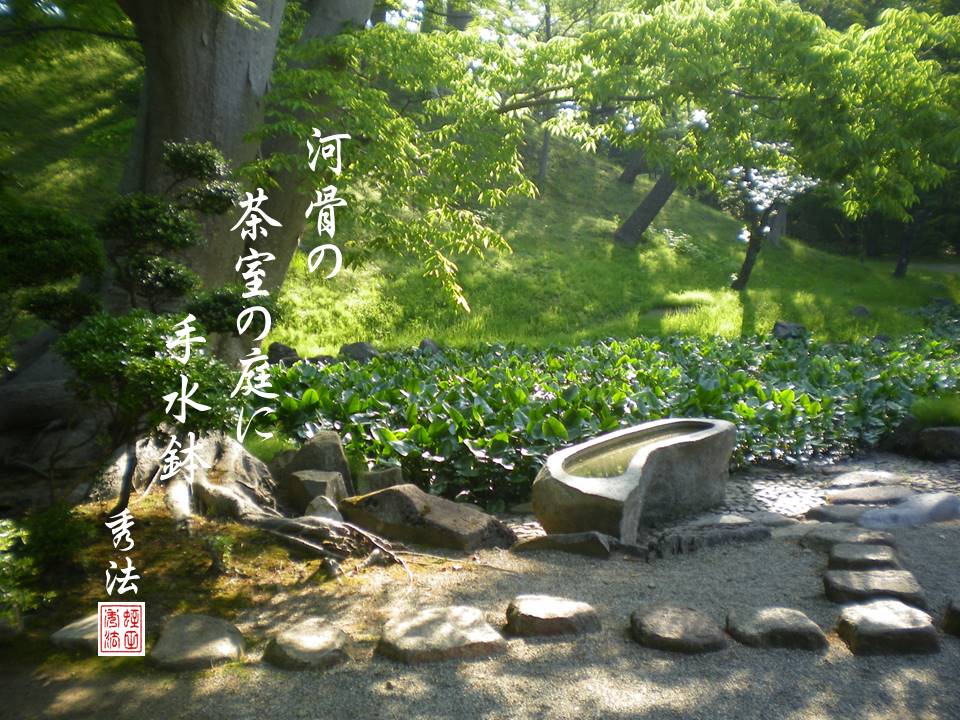(kōhone no chashitsu no niwa ni chōzubachi)