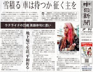 2022(令和4)年3月、中日新聞に「地下壕から平和を願う英語俳句 ウクライナ・ハリコフの23歳」という記事が掲載されました。