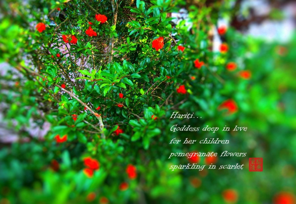 子をおもふ情愛ふかき訶梨帝母ザクロの花の紅緋きらめく