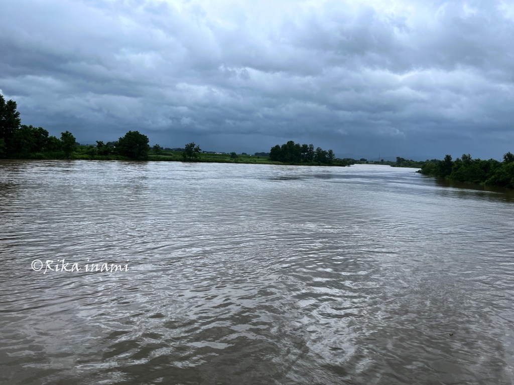 The river in the photo is not the Taihei River in Akita City but the Omono River, the largest river in Akita Prefecture. Though my area had frequent warnings, the river did not overflow, and we were unaffected.