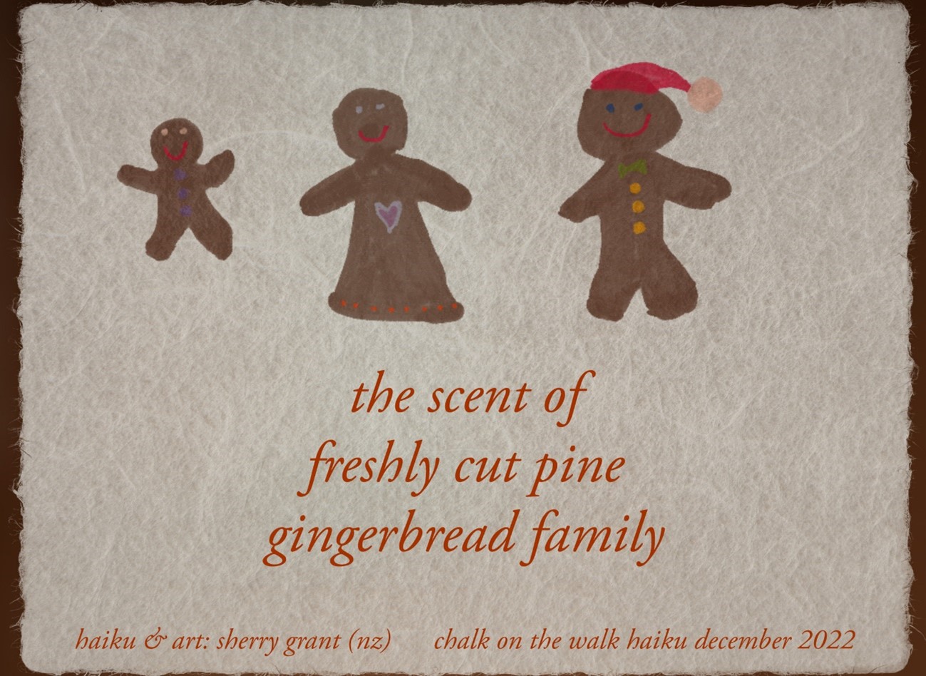 — Sherry Grant (art/haiku, NZ), Chalk on the Walk Haiku December 2022