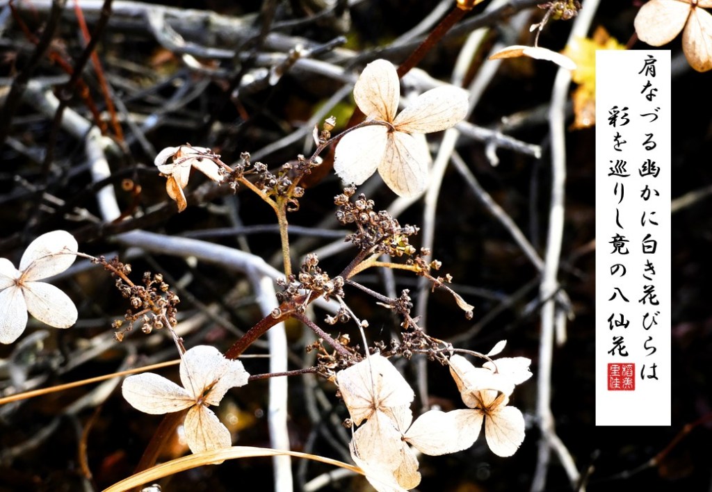 肩なづる幽(かす)かに白き花びらは彩(いろ)を巡りし竟の八仙花