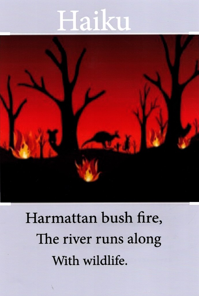 ハーマタン森林火事に川流る川沿い走る野生動物 (短歌)