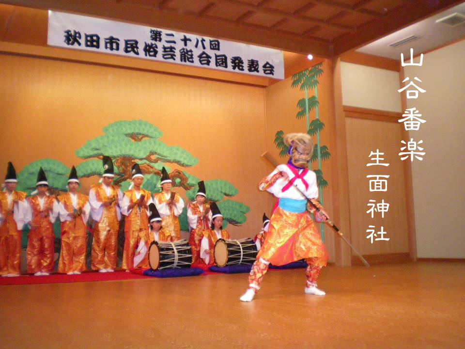 Fifteen masks were used in performing a sacred music and dancing called “Bangaku.” They are called “Live mask”「生面」in Yamaya area. The masks themselves have been deified and worshiped as the deities of Seimen-jinja Shrine「生面神社」. Some of them were carved into in the Kamakura period, so the sacred music and dancing has been passed down to the followers of the shrine from the yamabushi, or the Ascetic, in those days. Today, the children in Yamaya area are learning how to perform their sacred music and dancing, giving their performances. Yamaya Bangaku was designated as an intangible folk cultural property in Akita City in 1967.