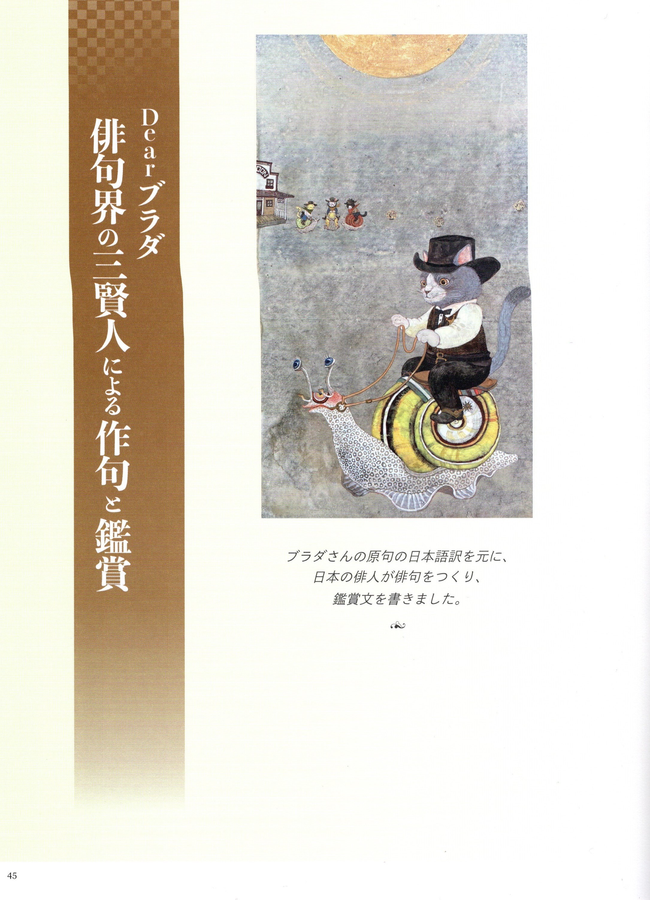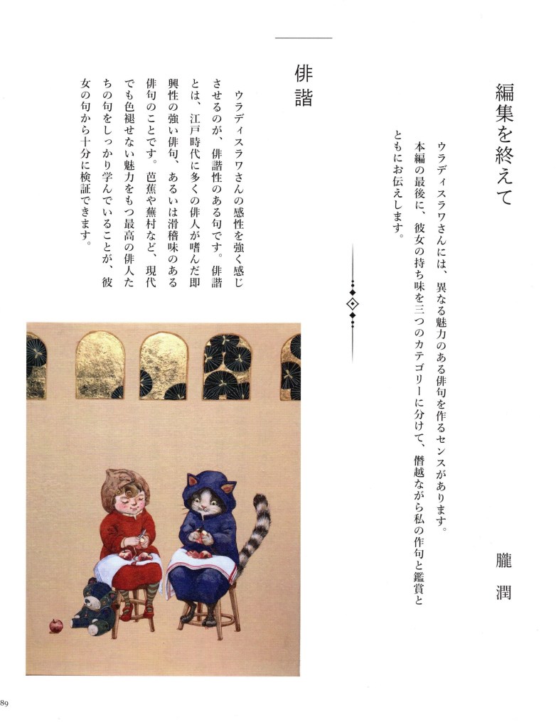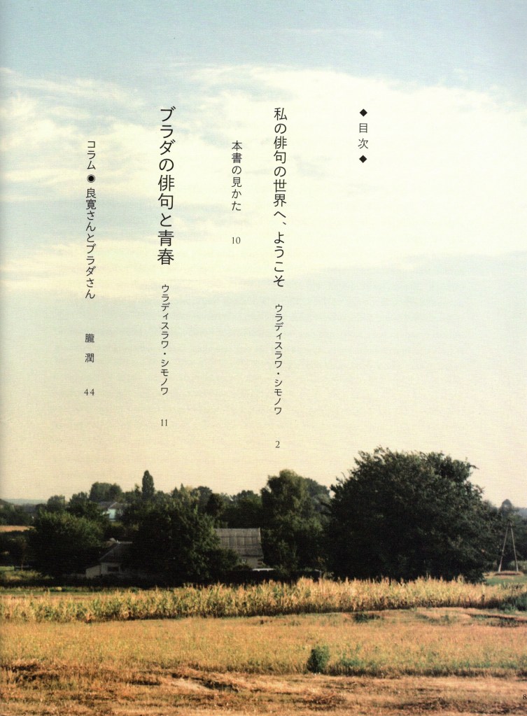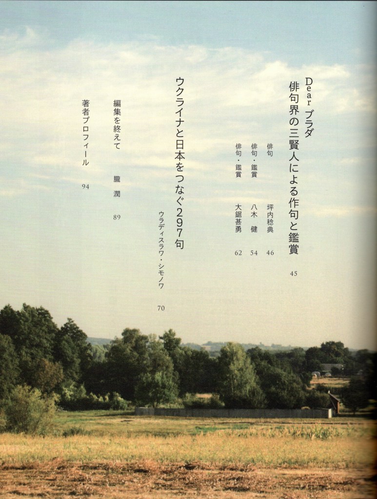 全297句と、著者自選の11句と本人によるエッセーを、ウクライナ語と日本語訳で掲載。日本語訳を元に、坪内稔典・八木健・大鋸甚勇の三氏が作句し鑑賞する章「Dear ブラダ 俳句界の三賢人による作句と鑑賞」も。著者のプライベート写真やウクライナの風景など50枚超と八木久子氏の日本画多数で構成された、全96頁フルカラーの、目でも楽しめる本。