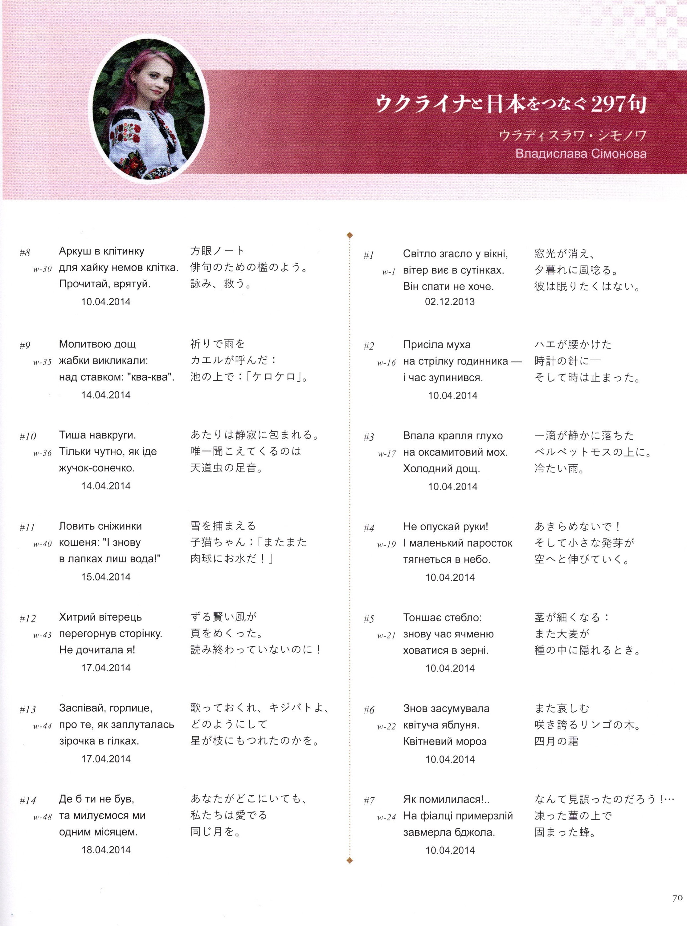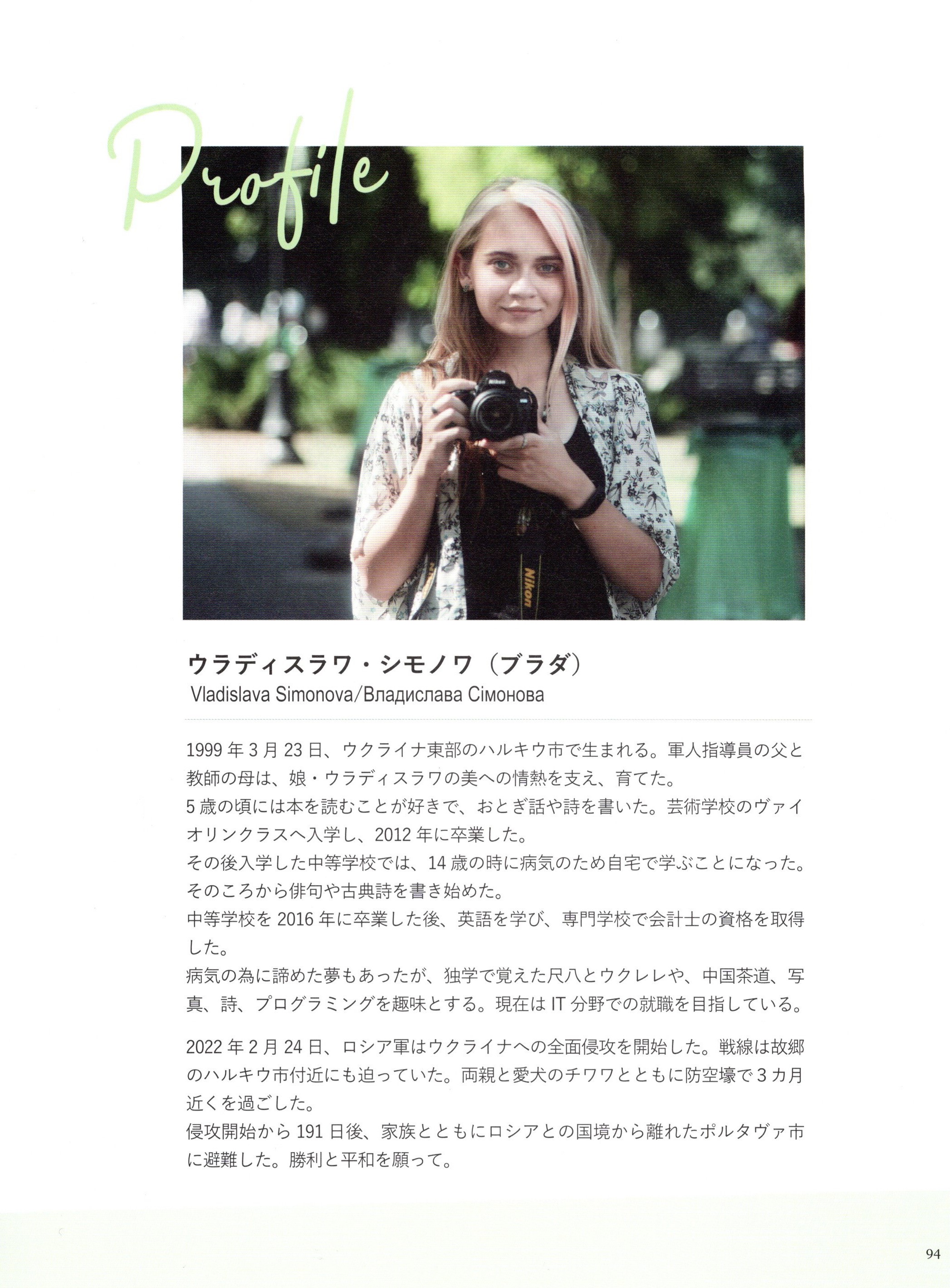 今もウクライナで俳句を詠み続ける若き俳人ウラディスラワ・シモノワ(Vladislava Simonova 愛称ブラダ)がウクライナ語で詠んだ俳句とその日本語訳を併記した俳句集。