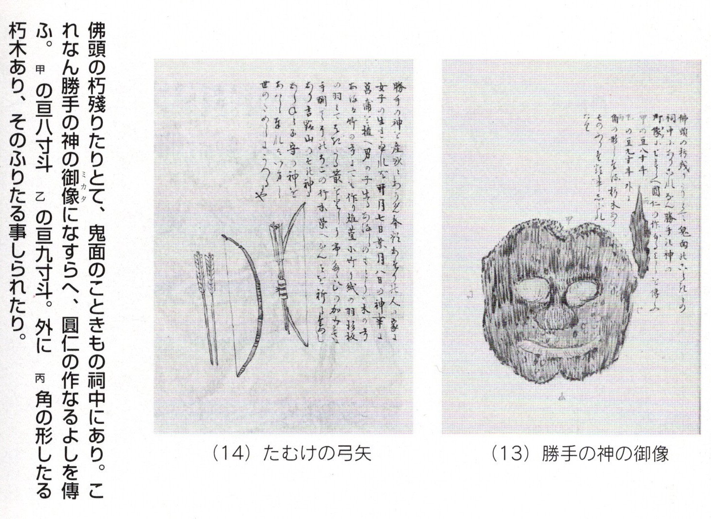 Masumi wrote in his diary, “Inside the shrine is what is said to be the decayed face of a Buddha, resembling a demon mask. This is said to be the image of a deity of the Katte Shrine, and is said to have been carved by Ennin.”