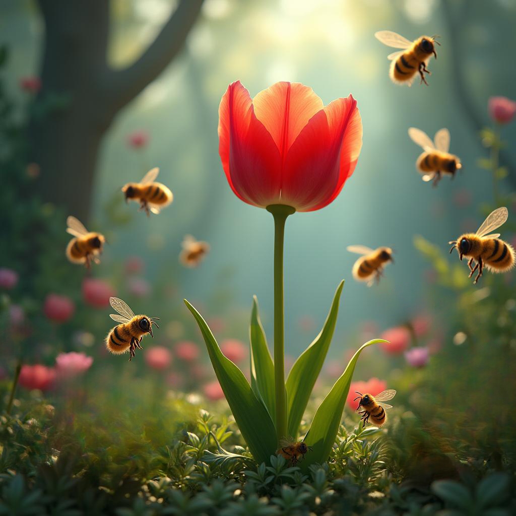 ブンブンと蜂飛び回る花壇には赤きチューリップ一本だけ