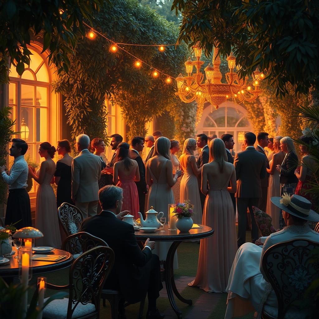 ガーデンのパーテイ中の会話の間合唱起こる夕暮れの庭