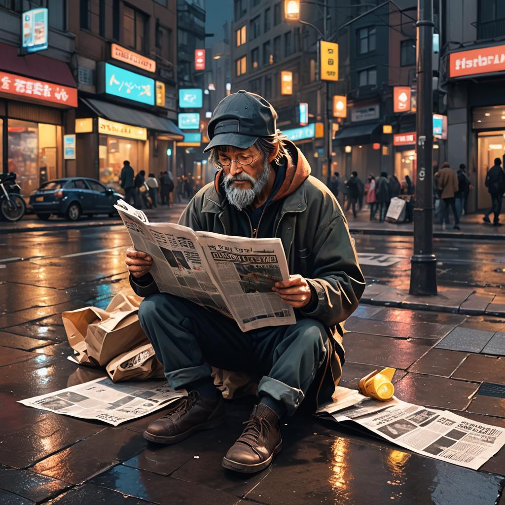 歩道にて今日の新聞読んでいる男性一人ホームレスなり