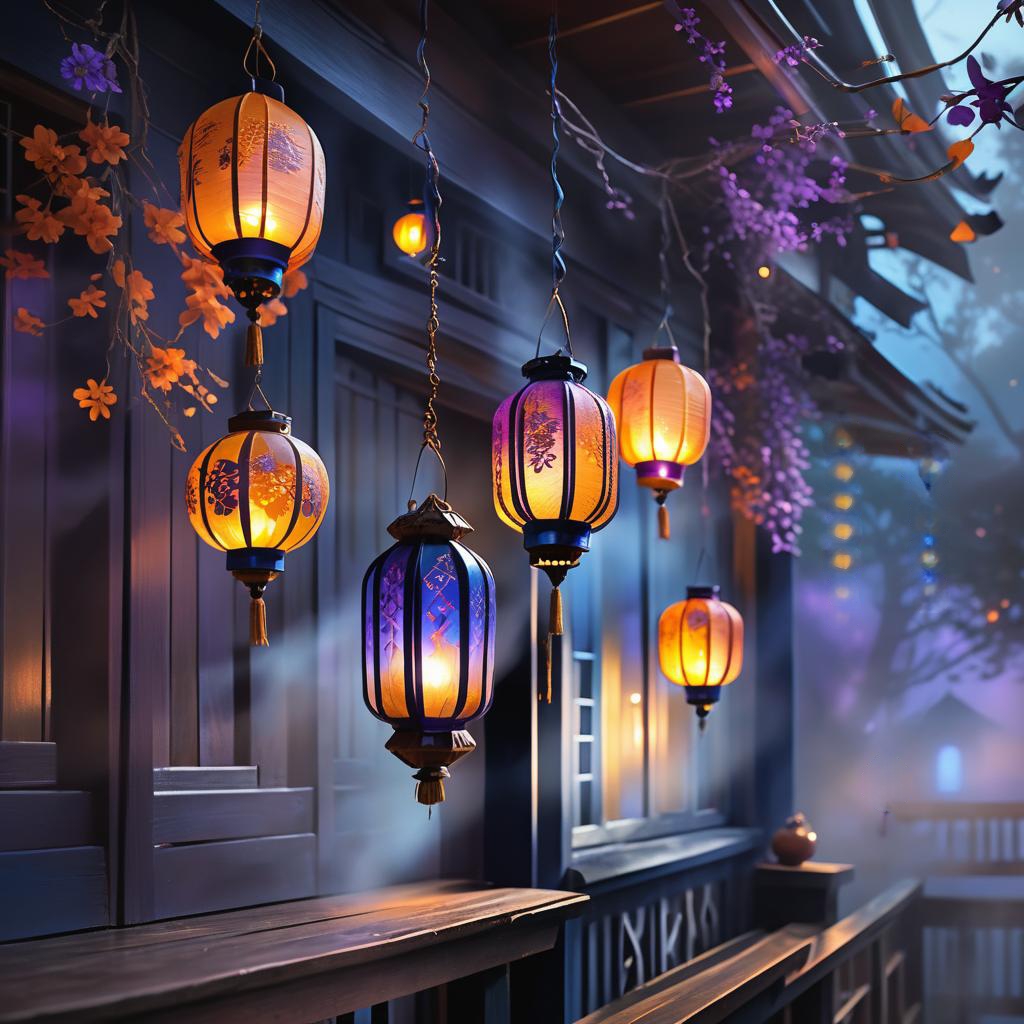 中秋の名月の射す玄関のポーチに掛かる提灯六つ